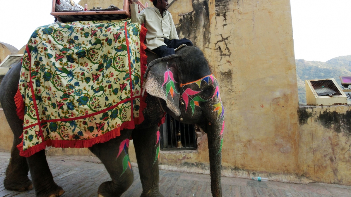 Touristentransport zur Amber-Festung: Nach getaner Arbeit macht sich ein farbenfroh bemalter Dickhäuter an den Abstieg. Im Alltag spielen Elefanten keine große Rolle für die Logistik. Gängige Transportmittel sind die Lastwagen und Fahrradrikschas. Seltener, aber nicht ungewöhnlich sind Pferdekarren; diese einfachen Wagen werden von je einem Tier gezogen.