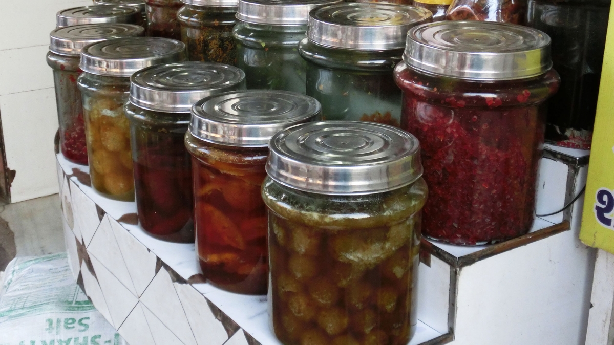 Eingemachtes: In der "Pink City" in Jaipur werden nicht nur Stoffe und Schmuck, sondern auch allerlei Leckereien und Snacks verkauft. Beliebt sind frittierte Teigwaren, die mit würzigen Soßen serviert werden, sowie frisches Obst und selbstgemachte Limonade ohne Kohlensäure.
