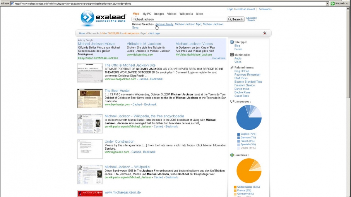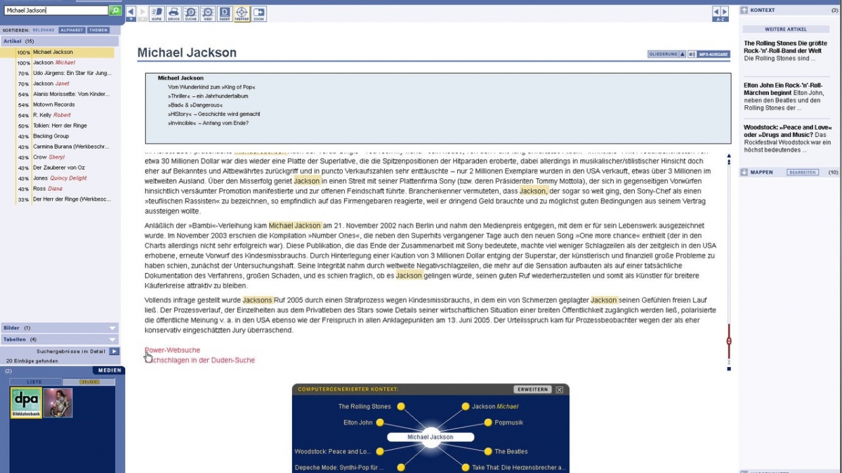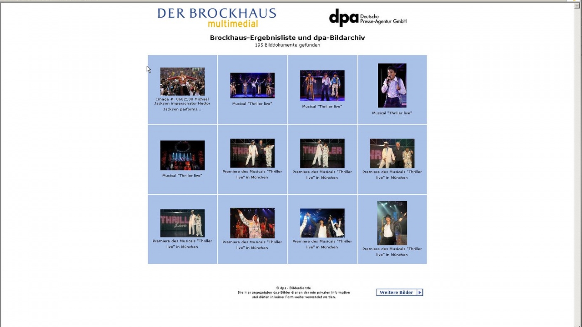 Wie sich das für ein Nachschlagewerk gehört, steht am Anfang der Suche der Lexikonartikel. Dieser hier beschreibt Leben und Werk Michael Jacksons und ist eingebettet in eine große Palette weiterführender Angebote.In der rechten Spalte zum Beispiel finden Sie weiterführende Artikel zu verwandten Themen. Die Vernetzung des Wissens meint aber auch den Sprung von den multimedialen Angeboten der neuen "Brockhaus multimedial 2010-Version" zu den ständig aktualisierten Texten und Bildern im Internet. Dorthin gelangt der Nutzer ganz einfach über die dpa-Bilddatenbank oder übre die Powerwebsuche unterhalb des Artikels. Wie das aussieht, sehen Sie nach dem nächsten Klick.Hier Brockhaus multimedial bestellen