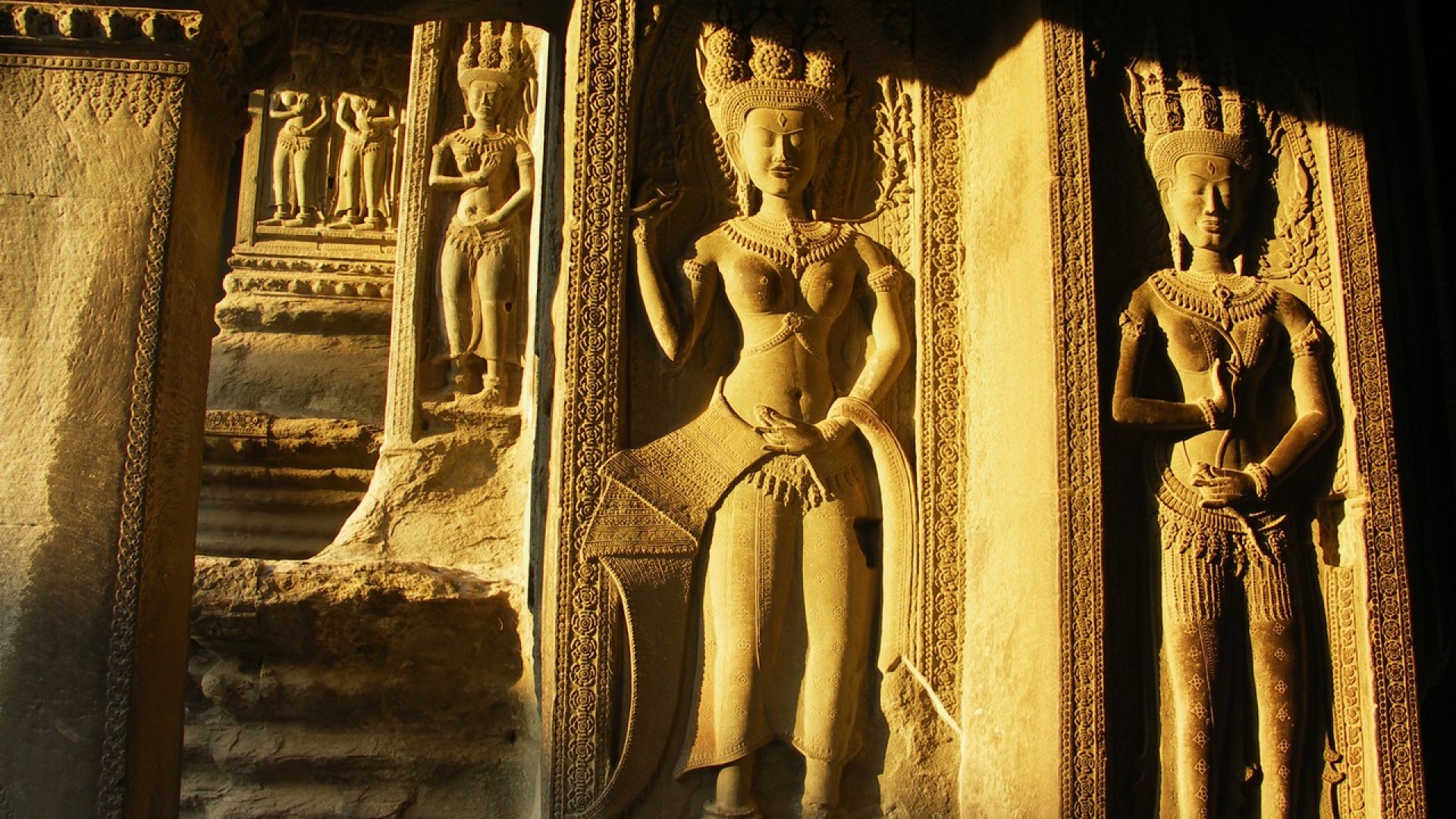 Detail des Oberkörpers einer Devada (Tempeltänzerin) in Angkor Vat
