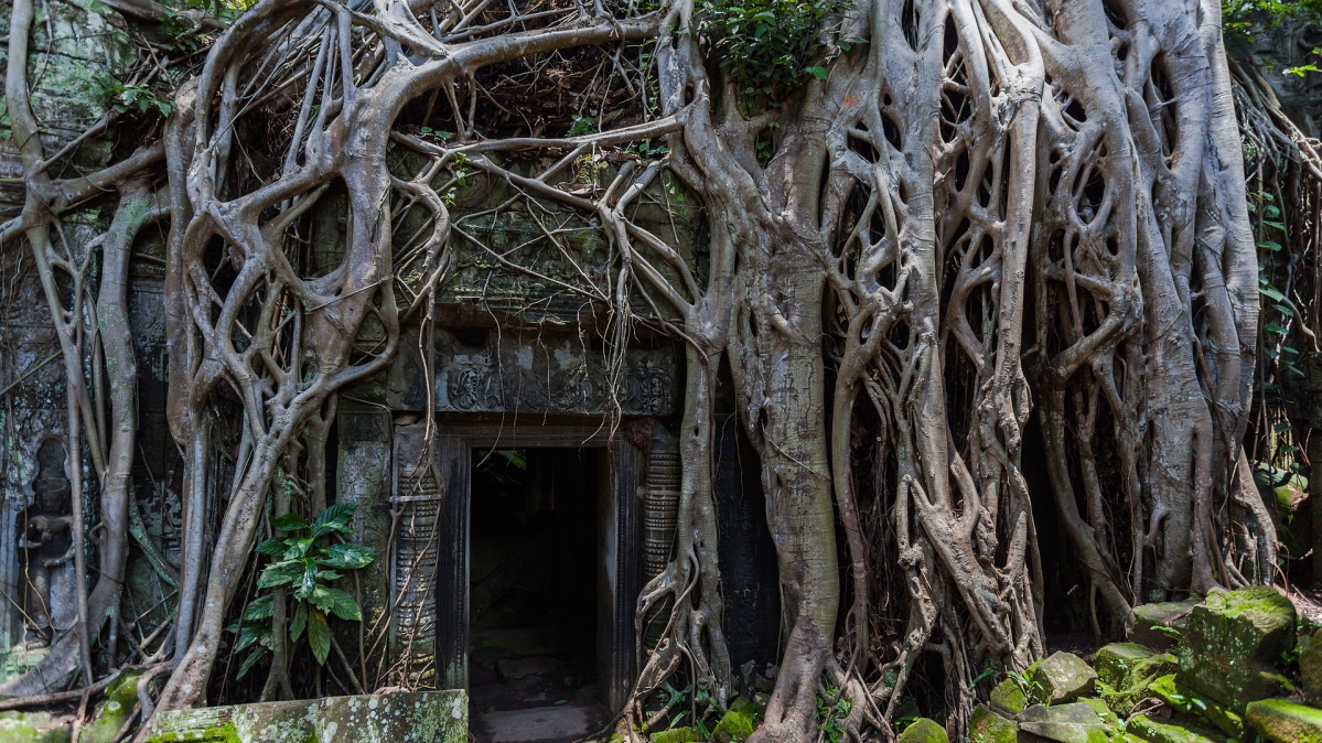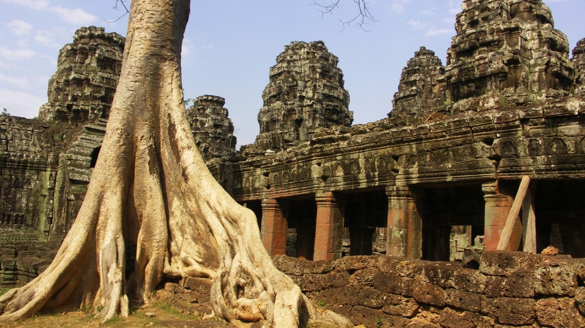 Zentrale Prasatreihe mit Würgefeige im Tempel Banteay Kdei; (Prasat = kambodschanische Bezeichnung für den Tempelturm, der auch als der Gipfel des Weltenberges Meru [indische Mythologie], dem Zentrum des Universums angesehen wird