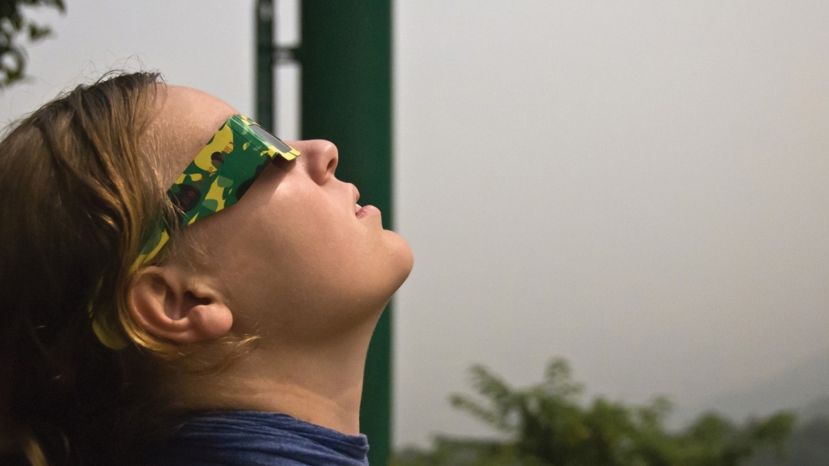 Natürlich zieht ein kosmisches Ereignis wie die Sonnenfinsternis die Blicke der Menschen magisch an. Allerdings sollten bei der Beobachtung von Sonennfinsternissen Schutzmaßnahmen getroffen werden. Die Frau, die mit einer speziellen Brille die Sonnenfinsternis in China am 22. Juli 2009 beobachtet, verhält sich vorbildlich. Diese totale Sonnenfinsternis war mit einer Dauer von 6,39 Minuten die längste totale Sonnenfinsternis des 21. Jahrhunderts.