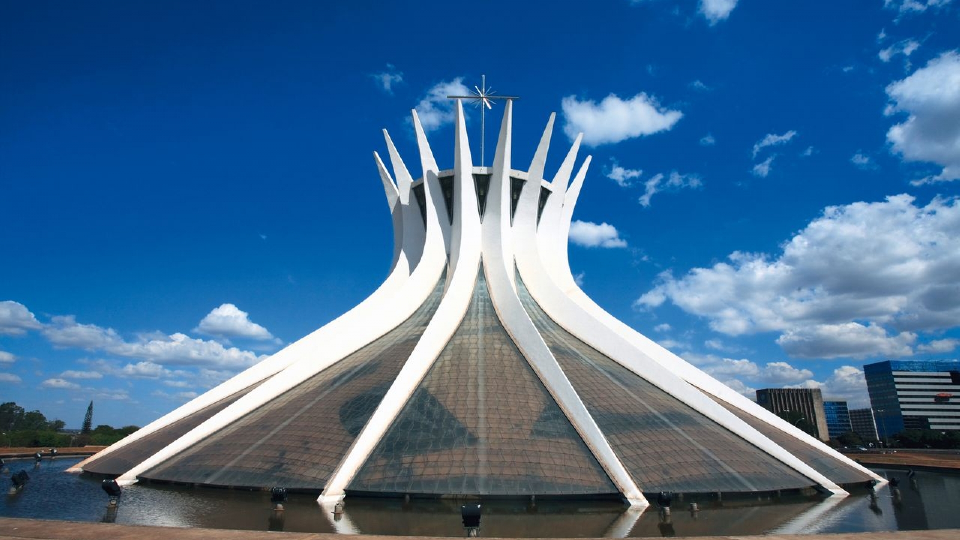 Die Kathedrale (Oscar Niemeyer), ein Rundbau, trägt als Dachbekrönung die monumental stilisierte Dornenkrone Christi. Der Innenraum der Dom-Bosco-Kapelle erhält durch große Fenster aus blauem Glas eine besondere Lichtwirkung.Die Grundkonzeption der Stadtplanung (Lúcio Costa) geht von einem als "Vogel" oder "Flugzeug" bezeichneten Grundriss aus, der von einer 13 km langen, parabelförmigen Hauptverkehrsachse mit den versorgungsmäßig fast autarken quadratischen Wohngebieten (240 × 240 m) und einer senkrecht dazu verlaufenden, kreuzungsfreien, 5 km langen Monumentalachse, an der Ministerien und andere Regierungsgebäude sowie Theater und die Kathedrale liegen, geprägt wird.