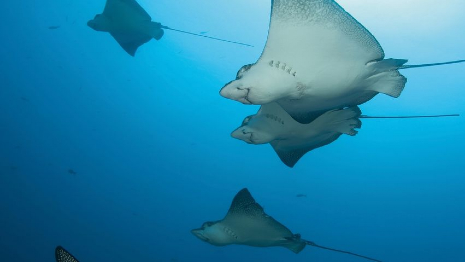 Der Adlerrochen ist ein Kosmopolit. Rochen leben allgemein gern in warmen Meeren, teilweise aber auch im Brackwasser der Flussmündungen und im Süßwasser. Dieses Bild zeigt Rochen im Meer bei den Galapagos Inseln. Adlerrochen werden bis zu einem Meter lang.