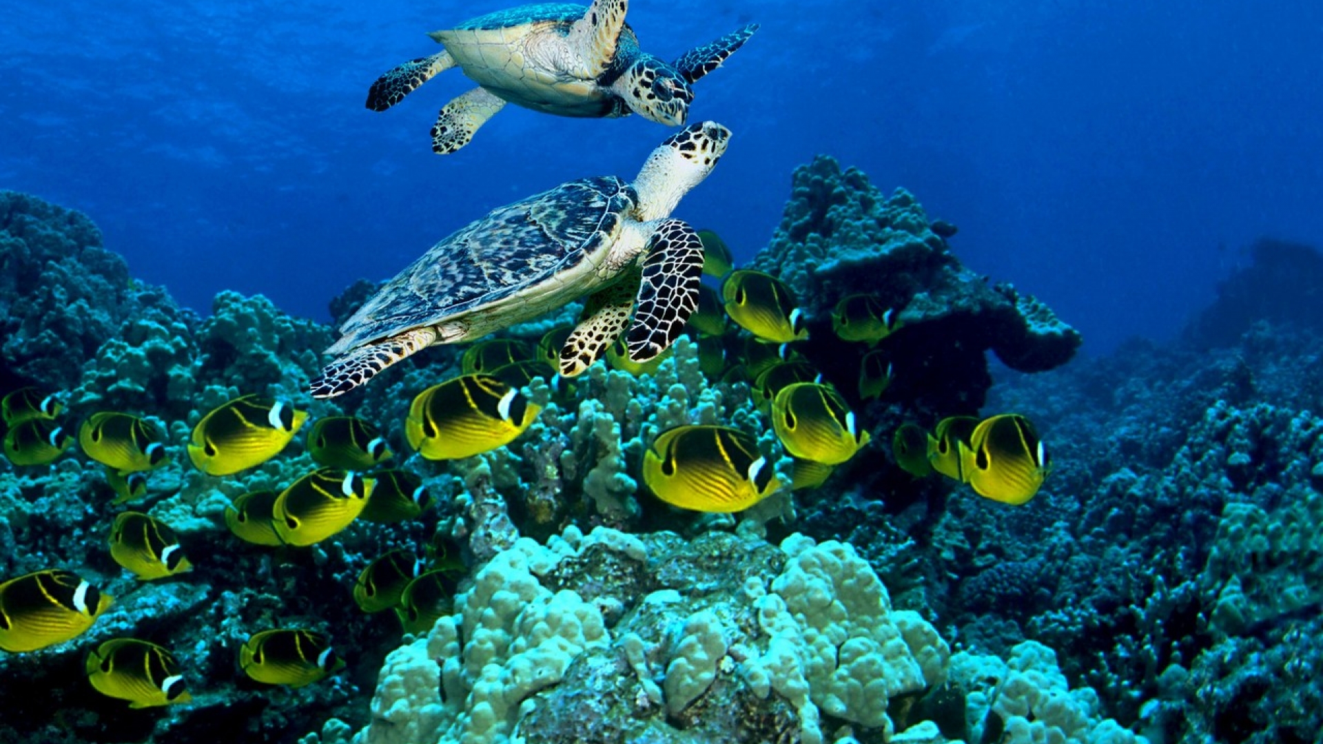 Friedliches Nebeneinander zwei ganz unterschiedlicher Meeresbewohner. Diskusfische leben im Mittellauf des Amazonas. Der Körper ist scheibenförmig und stark zusammengedrückt. Meeresschildkröten haben einen flachen, stromlinienförmigen Panzer, der nicht völlig verknöchert ist. Die Schildkröten gehen nur zur Eiablage an Land.