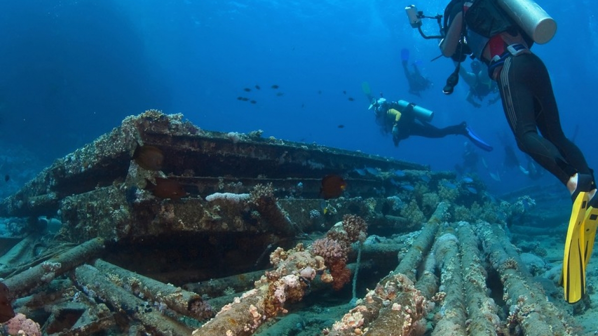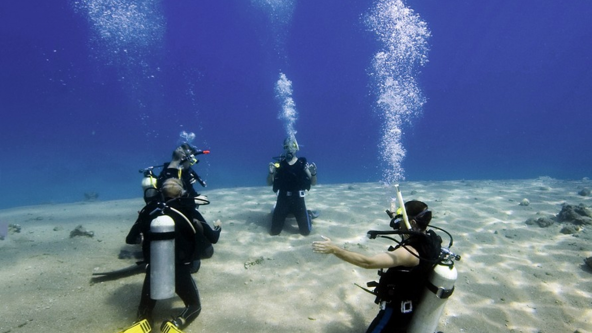 ... Wenn es tiefer hinab geht, kommen noch Pressluft-Atemgeräte, Druck- und Tiefenmessgeräte bzw. Tauchcomputer und ein Unterwasserkompass hinzu.