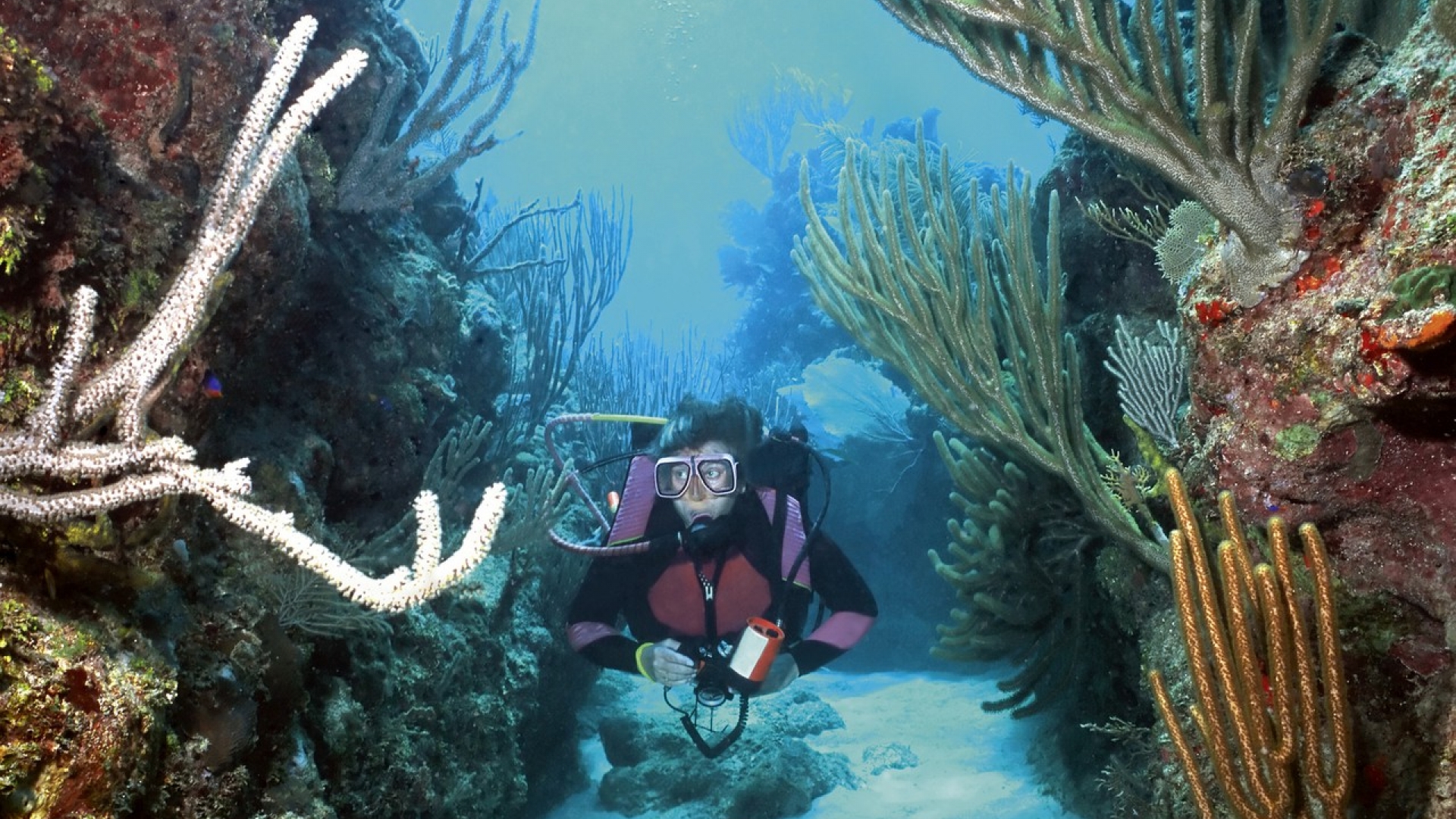 Diese Taucherin schwimmt durch das Korallenriff bei den Islas de la Bahias in der Karibik. Die Inselgruppe besteht aus den Inseln Utila, Roatan und Guanja sowie zahlreichen Koralleninseln.
