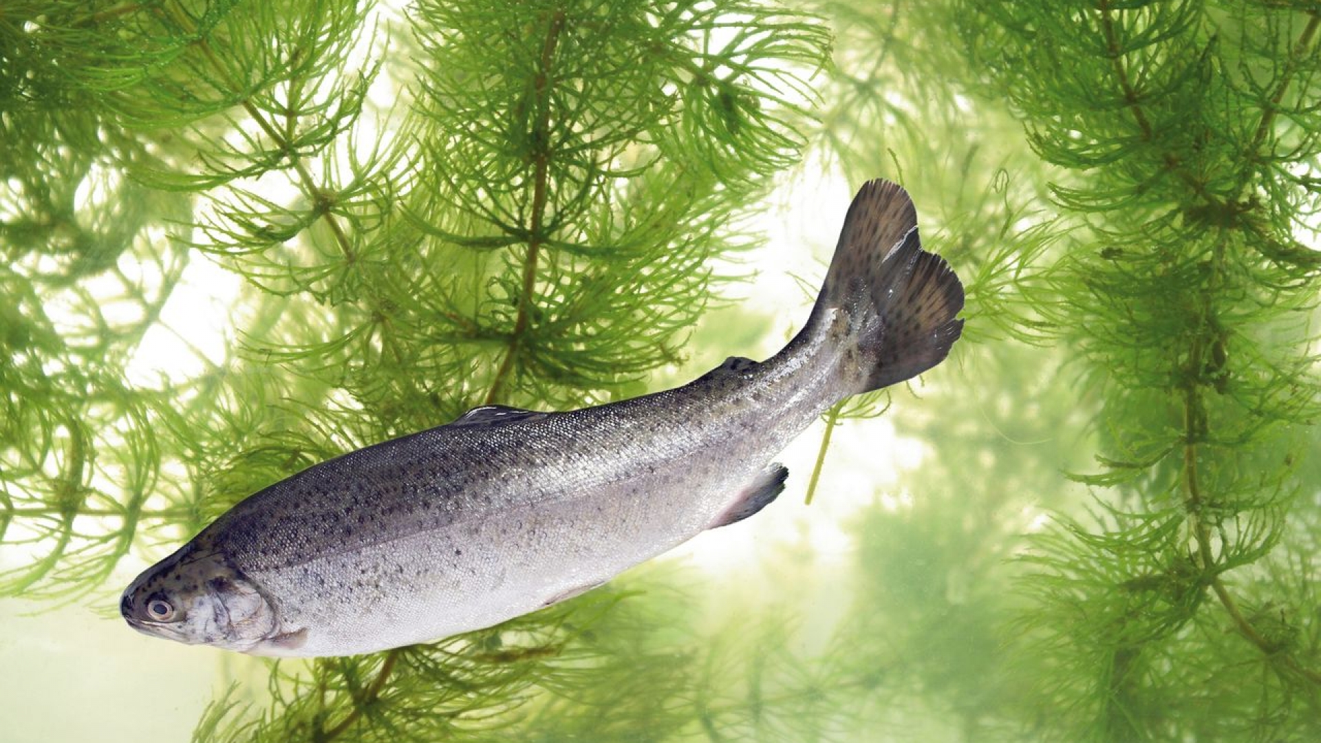 Im Grün des Unterwassers fühlt sich die Forelle wohl. Forellen gehören zur Familie der Lachsfische. Bei uns ist er als Sport- und Speisefisch beliebt.