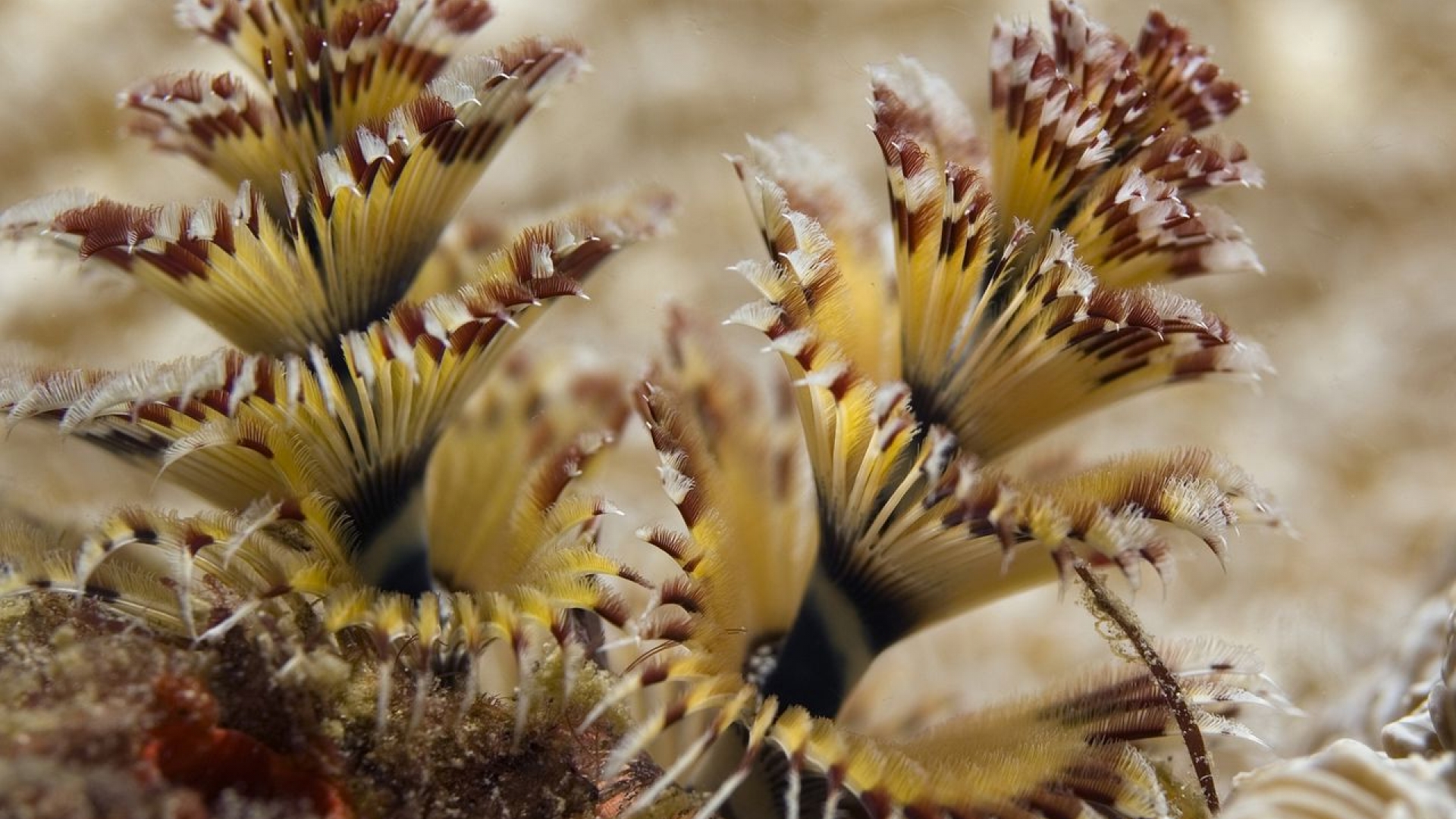 Was hier nach Pflanzen aussieht, sind Röhrenwürmer, auch Weihnachtsbaumwürmer genannt. Röhrenwürmer graben sich Wohnröhren in den Sand, aus denen sie nur ihr Vorderende herausstrecken, um mit den Tentakeln Nahrung herbeizustrudeln.