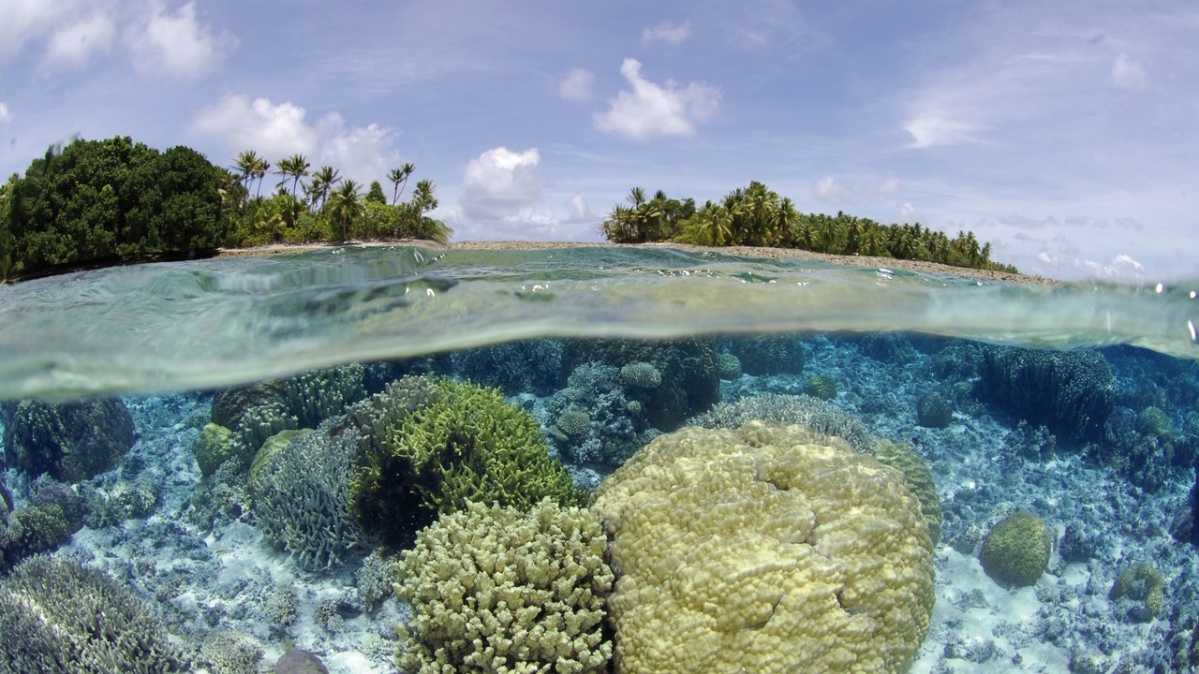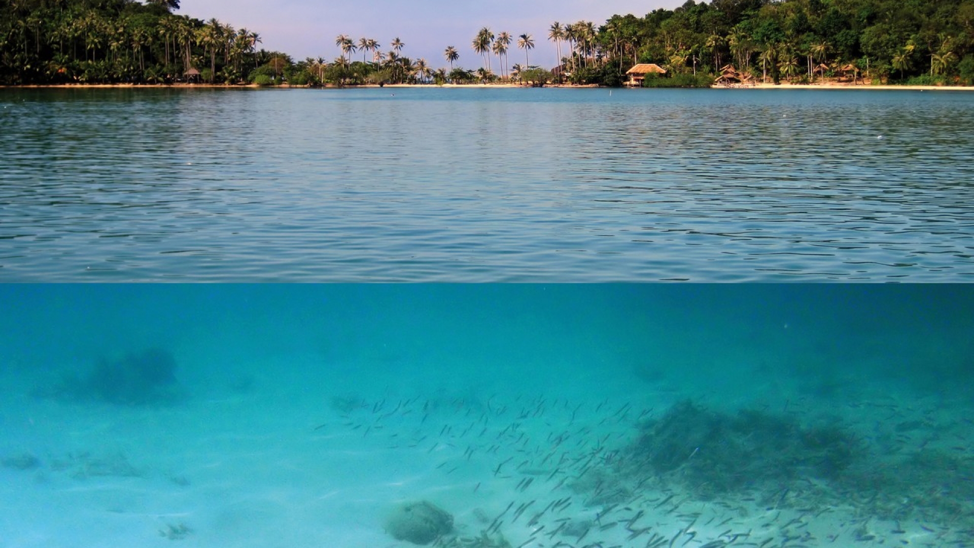 Wie ein Querschnitt durch die Welt oberhalb und unterhalb des Ozeans! Das Riff liegt in der Gegend Majuro vor einer einsamen Insel.