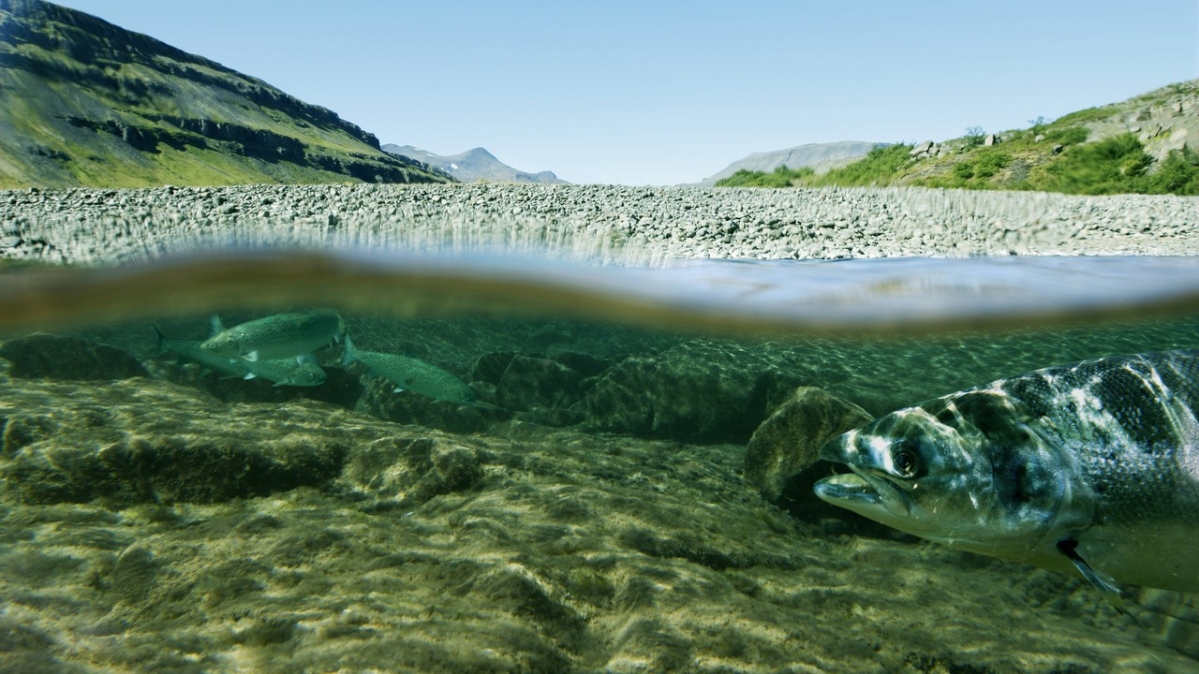 Was man oft eher als geräucherten Leckerbissen kennt, schwimmt hier im Flussbett bei Island ins Bild: der Lachs.