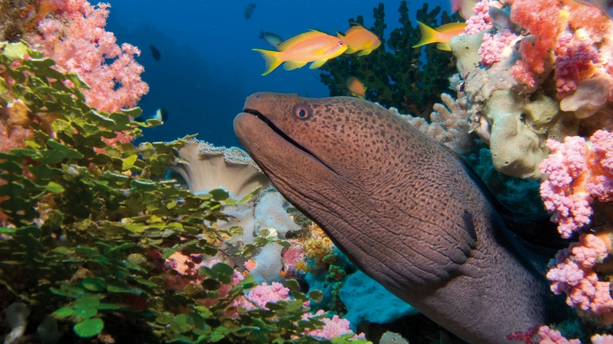 Der Muräne liebstes Zuhause ist das tropische Gewässer. Hier sieht sie aus wie eine Schnecke, die ihren Hals aus dem Schneckenhäuschen auf den Malediven streckt. Muränen sind aalartige Knochenfische.