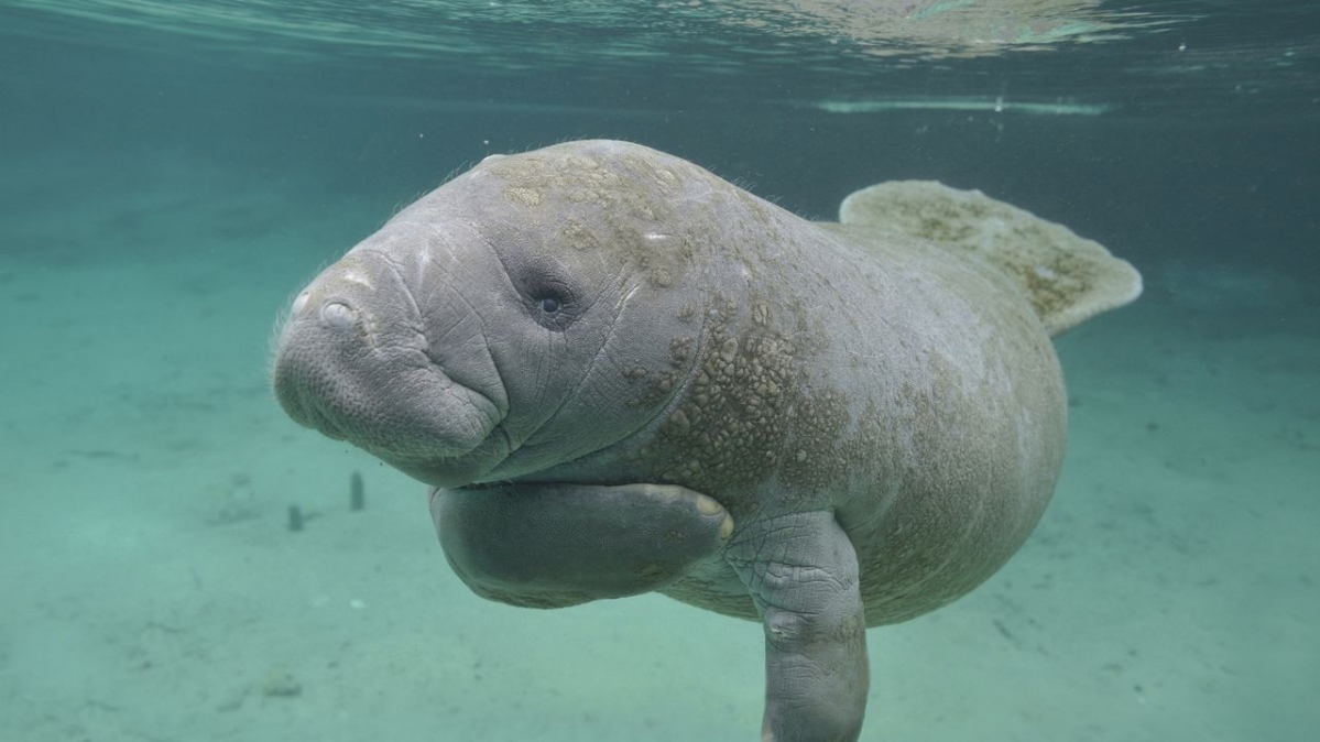 Freundlich-zerknautschter Blick, die Hand auf der Brust - es fehlt nur die die Verbeugung. Dieses Tier ist ein Manati, eine Seekuh. Manatis werden auch Rundschwanzsirenen oder Rundschwanzseekühe genannt und leben im Meer der Karibik.