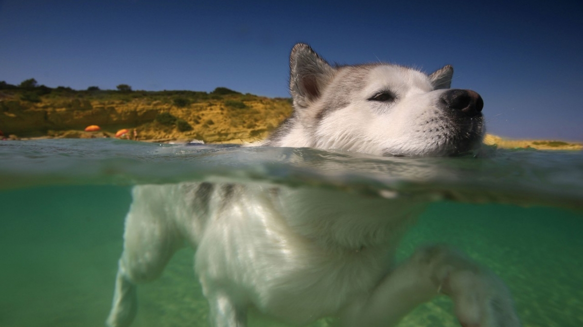 Hunde im Wasser strampeln ordentlich. Bei diesem Hund handelt es sich um einen Polarhund. Die Huskys sind in Nordsibirien und Alaska zu Hause.