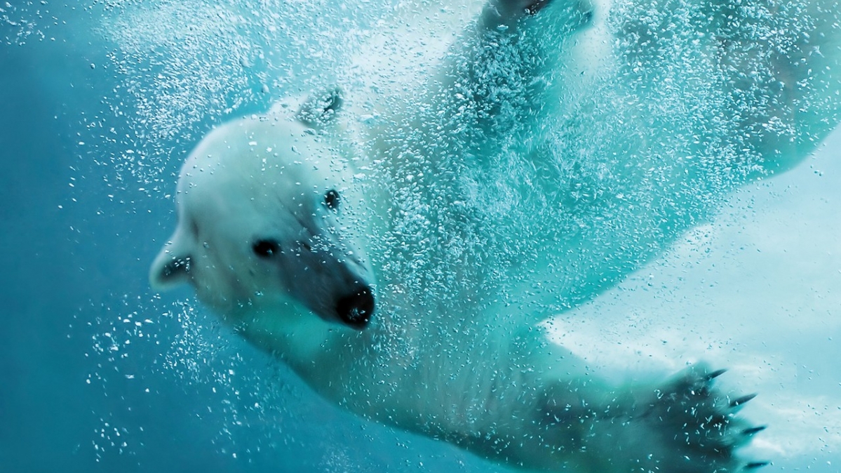 Tauchvergnügen eines Eisbären. Kopfüber ins Meer und das Wasser schön aufschäumen! Eisbären sind gute Schwimmer. Sie werden bis zu 2,50 Meter lang und können rund 450 Kilo wiegen.