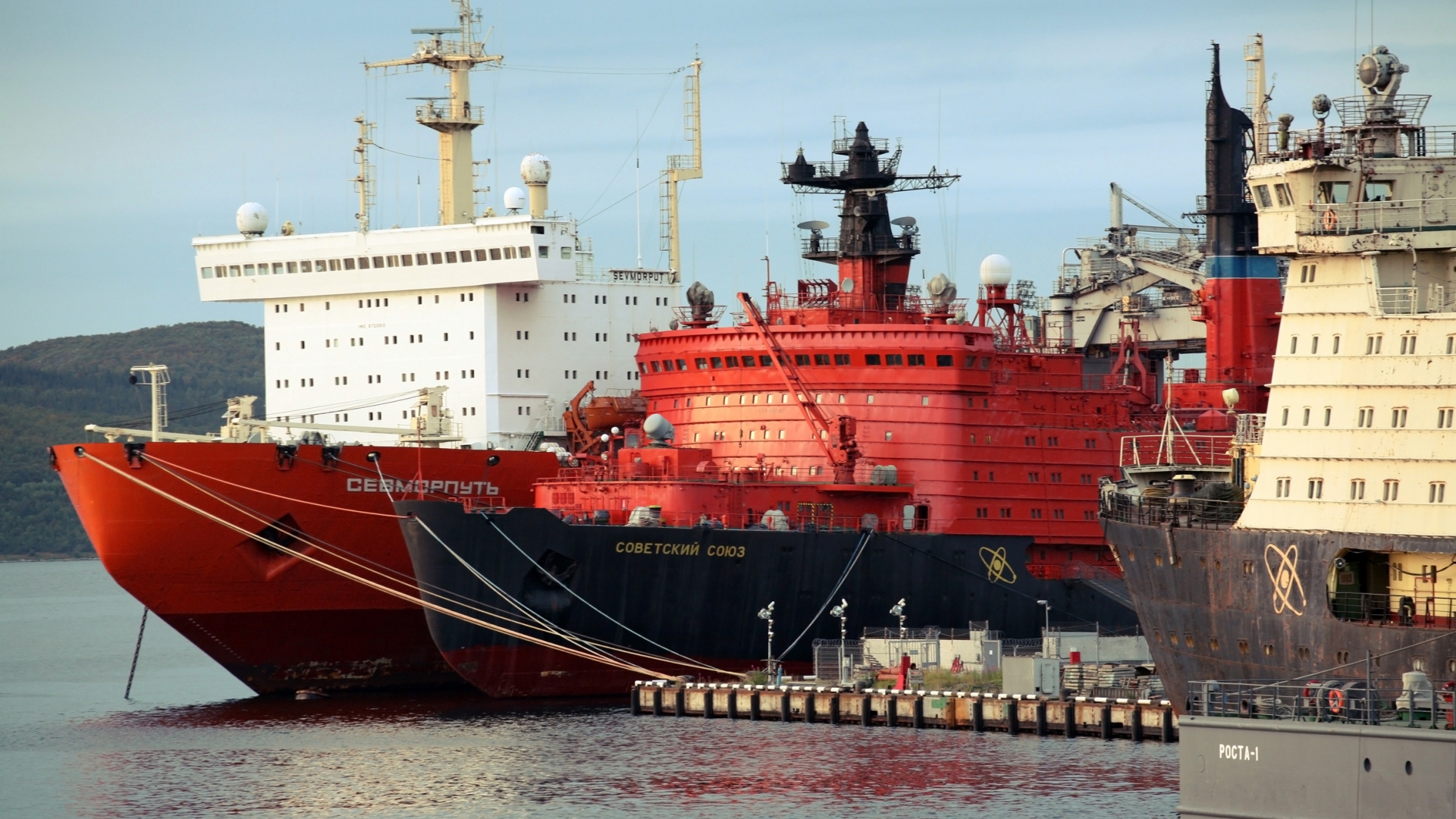 Der erste Atomeisbrecher wurde 1957 auf den Namen Lenin getauft. Heute dient er als Museum und Informationszentrum. Wie der Name schon vermuten lässt, werden Atomeisbrecher durch einen Kernreaktor angetrieben. Dieses Bild zeigt die Atomeisbrecherflotte im russischen Murmansk.