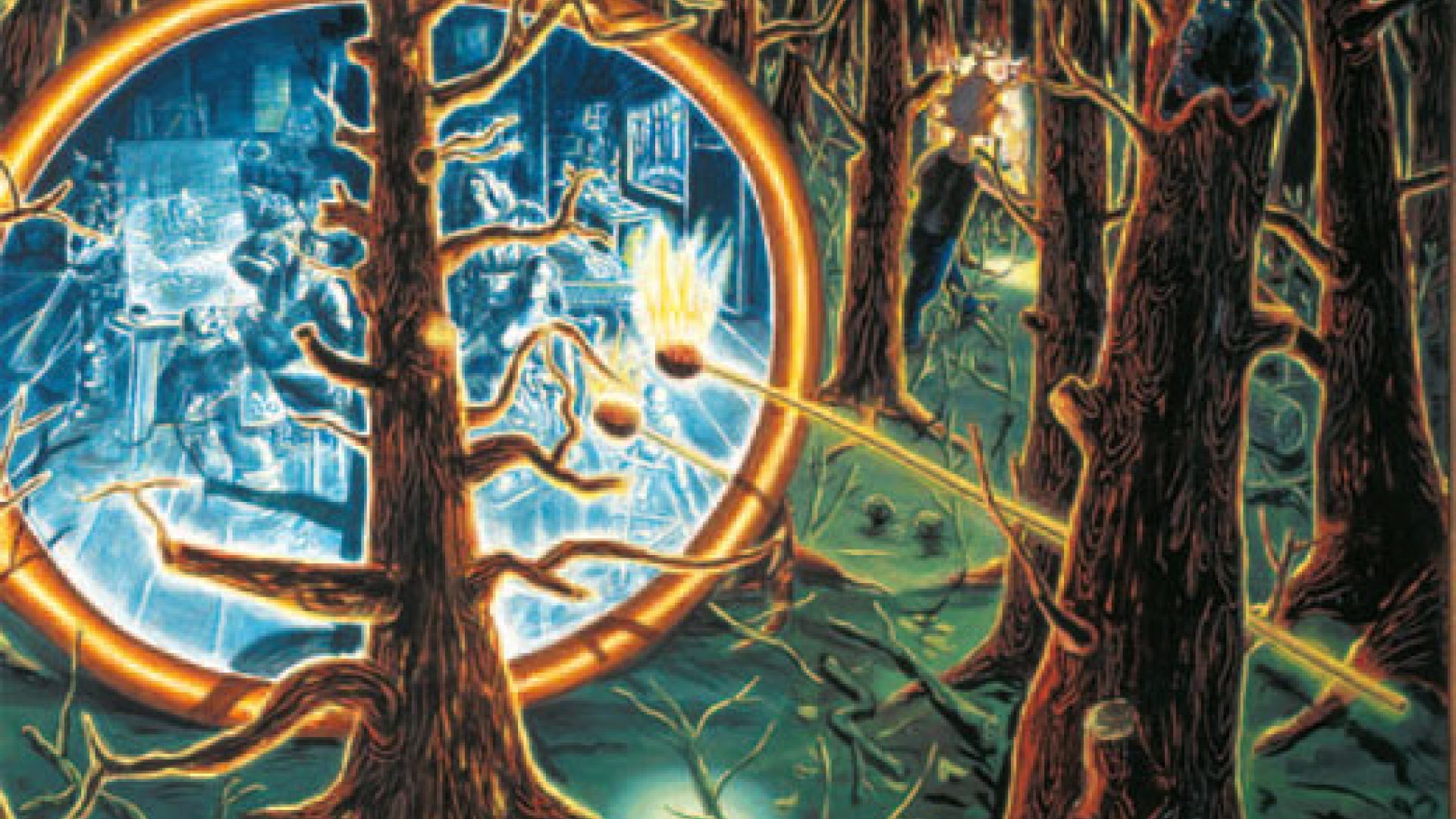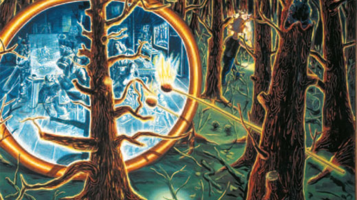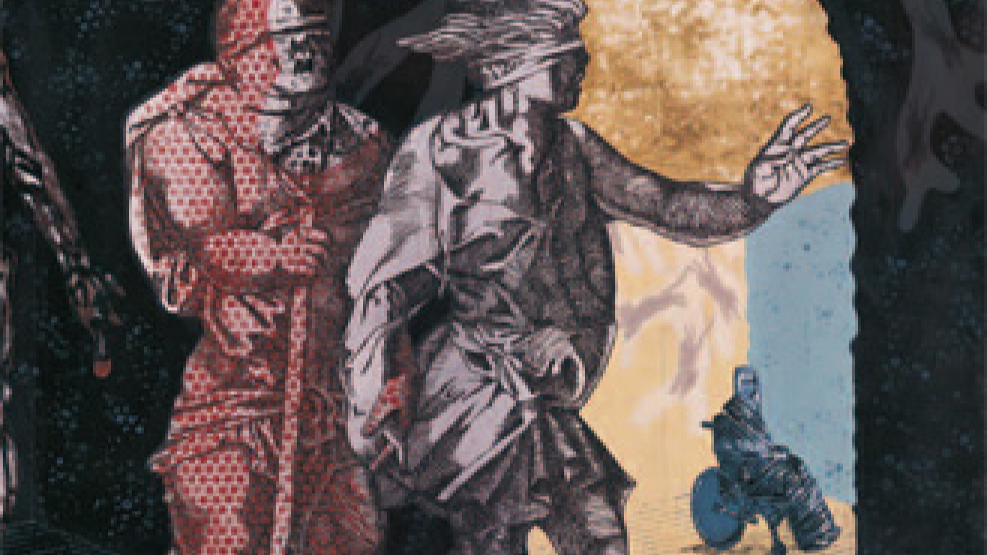 Weltenwald – Fortsetzung des Dunkels. Der Suchende wandert weiter, über den Kopf gezogen hat er die Kappe mit den Tugenden und Lastern, die für seine Orientierungslosigkeit steht. Dasklassische Symbol des Spiegels verweist auf die Rolle der Kunst („Dem Menschen den Spiegel vorhalten“) – um so mehr, als im Spiegelglas lauter Zitate aus der Kunstgeschichte vorkommen. Hineingeworfen in die Trostlosigkeit eines verdorrten Waldes wirkt die Kunst als leuchtendes Gegenbild, doch der Suchende läuft an ihr vorbei. Immendorffs Selbstreferenzen zur Kunst nehmen zu. [Die Abbildung zeigt einen Ausschnitt.]