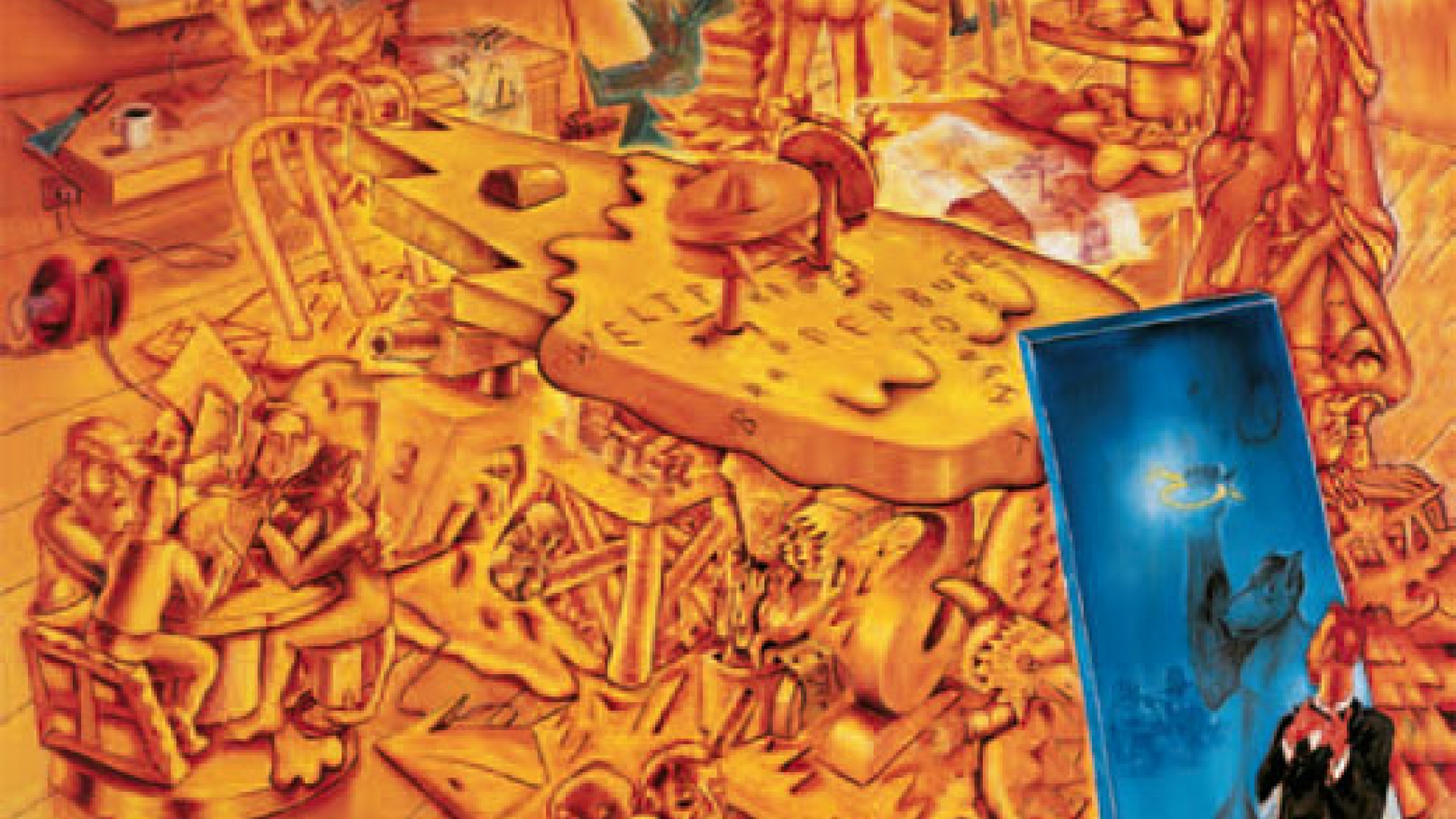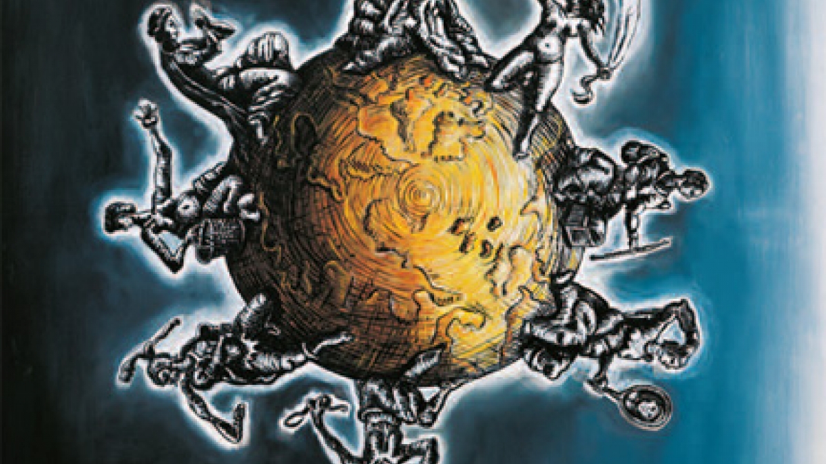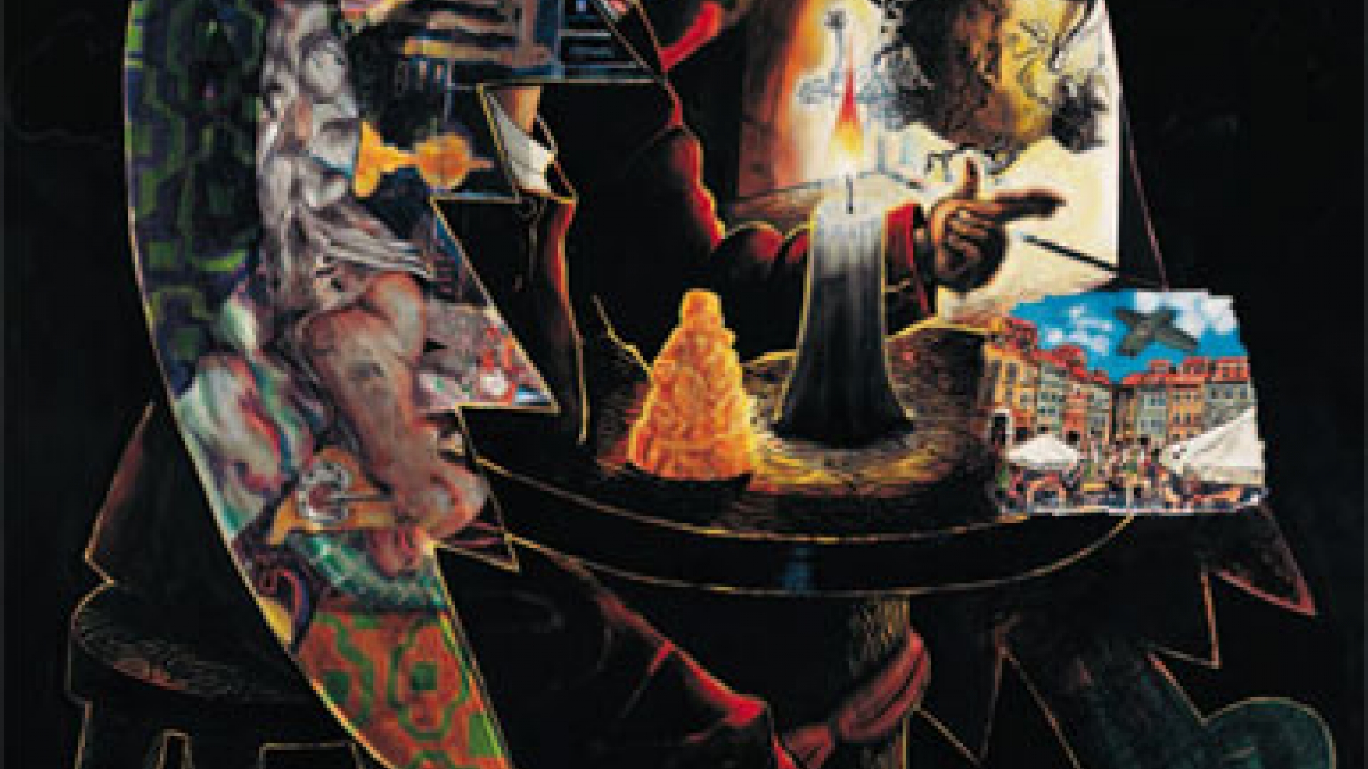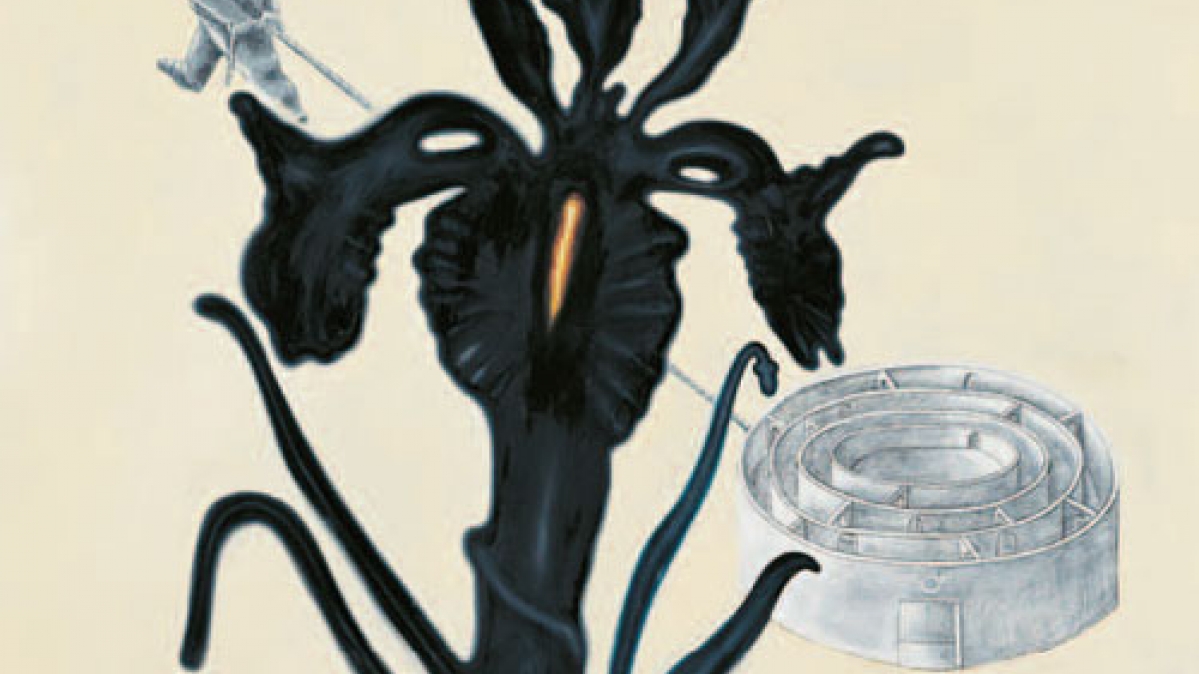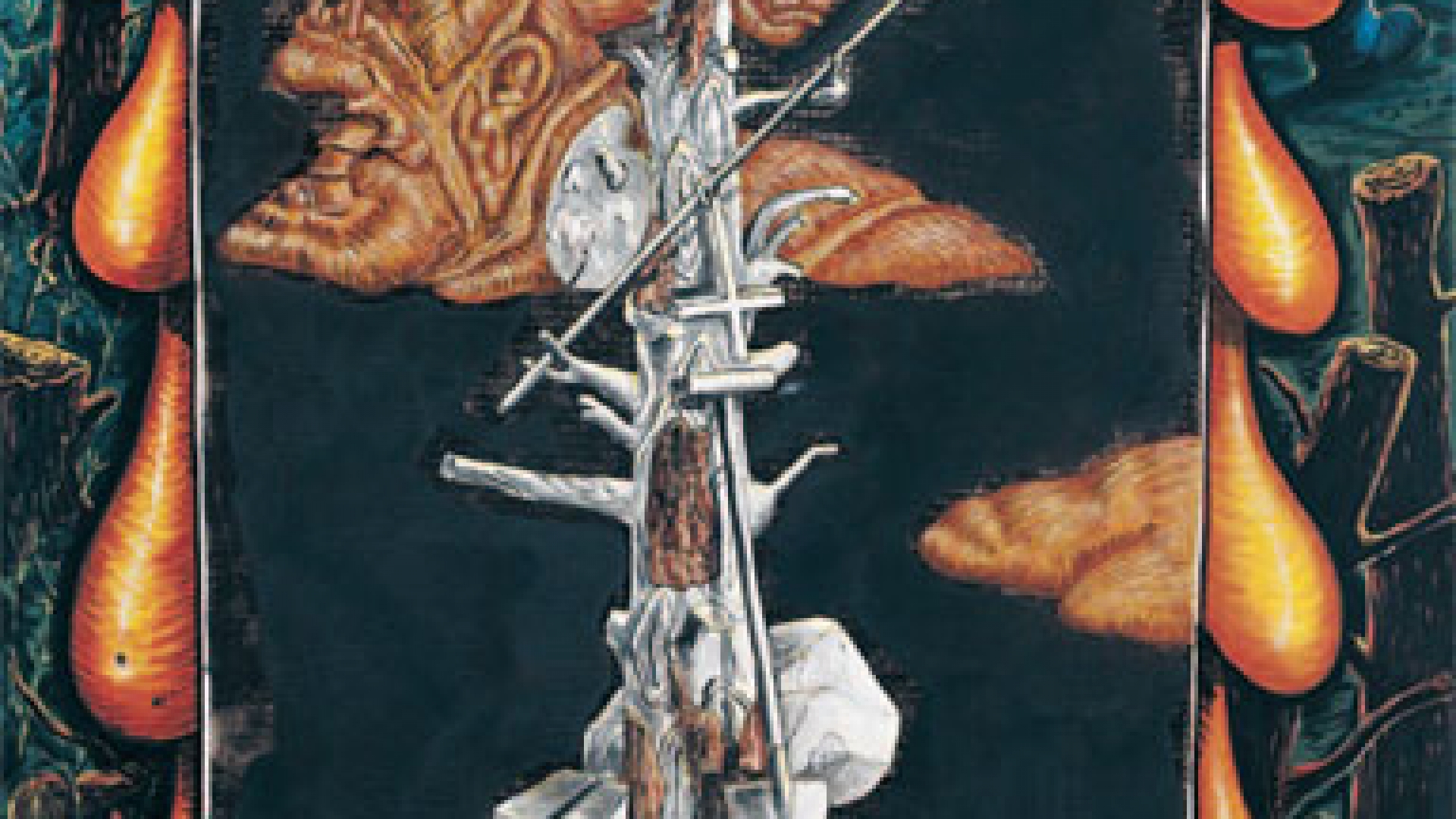 Damit richtet sich schließlich der Blick auf den Künstler und seine Rolle im existenziellen Dschungel. Die ambivalente Welt/Das Rad der Fortuna erscheinen im reflektierenden Blick des Suchendenebenso wie der Turm von Babel und die Bedrohung des Menschen durch Krieg. Der Künstler zeigt auf ein außerhalb des Bildes liegendes Ziel. Eine mögliche Lösung? Allenfalls scheinbar, denn am Finger kriecht ein Wurm in die andere Richtung, und der Künstler blickt starr auf den Finger, nicht in die Richtung dieses Ziels.