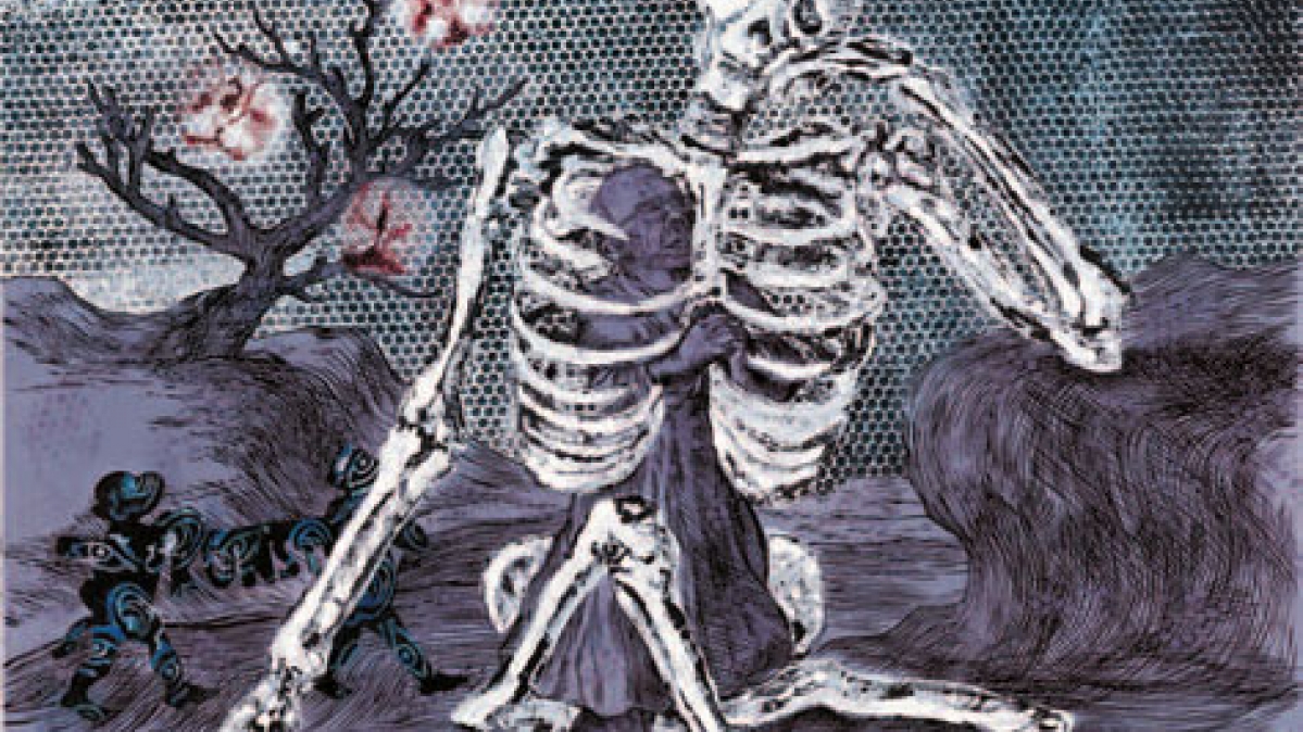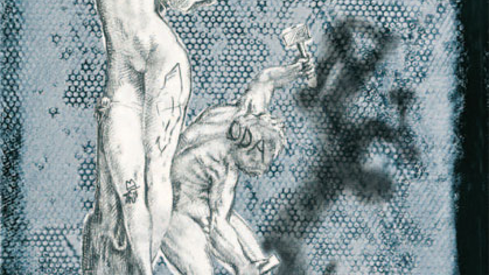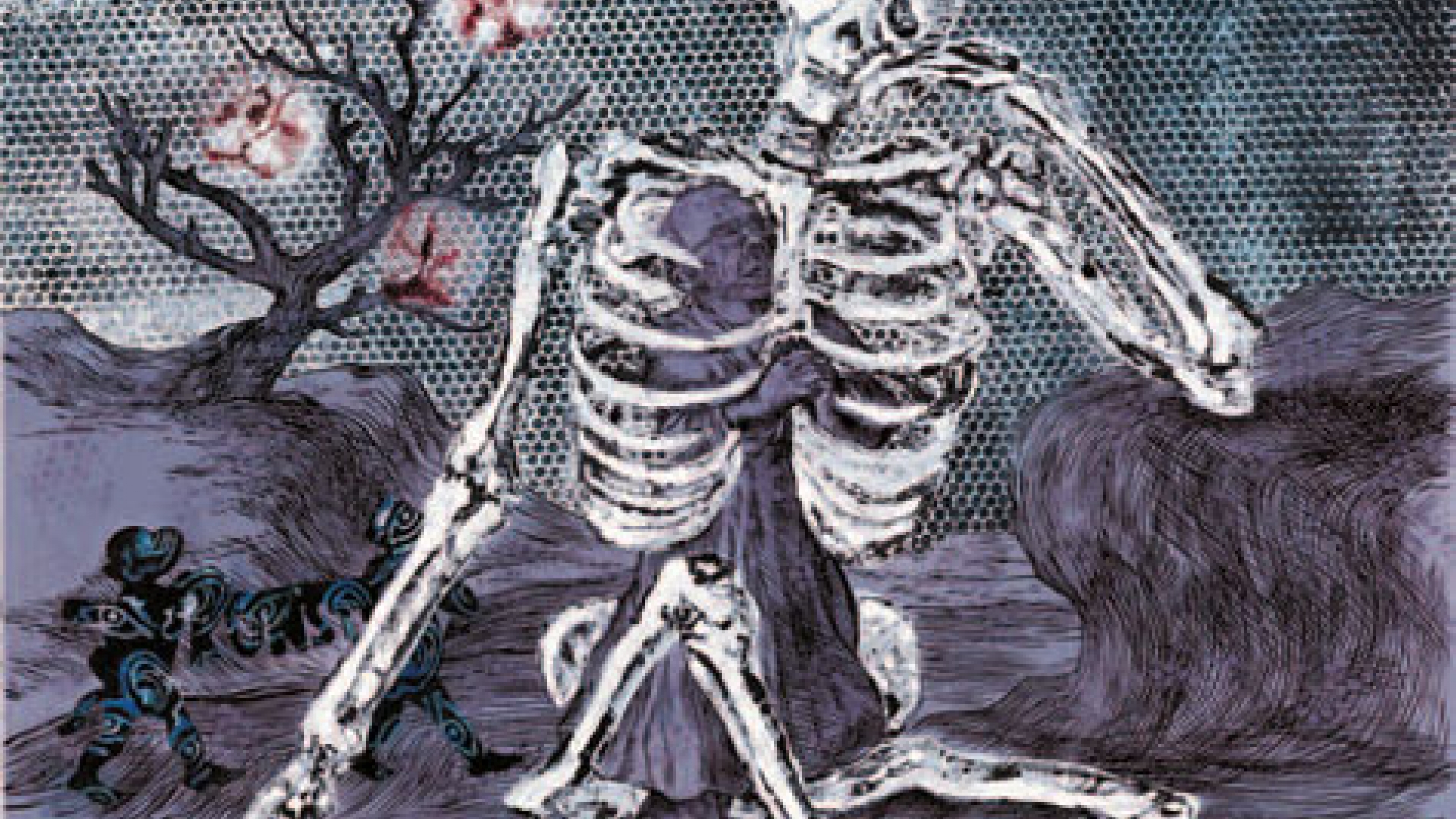 Hintergrund der überall waltenden Verzweiflung ist die Angst vor dem Tod, eindringlich dargestellt durch die Figur des Betenden im Skelett. Zwei Affen tragen ein Transparent mit der Aufschrift„Kunst“ herein. Ist das, oder vielmehr SIE, die Lösung?