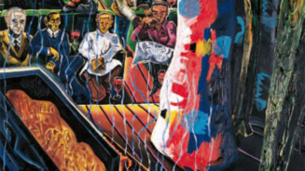 Künstler und Gelehrte sind in einem Auditorium versammelt, um auf einen Lkw zu schauen, der seine irdene Last auskippt. Die Dargestellten sitzen völlig beziehungslos nebeneinander,die Schaukel überträgt die Szene ins Groteske. Der Bezug im Titel auf Wilhelm Lehmbruck (seine berühmte Knieende wird zitiert), der sich 1919 das Leben nahm, erinnert abermals an den Tod als generelle Bedrohung des Lebens.[Die Abbildung zeigt einen Ausschnitt.]