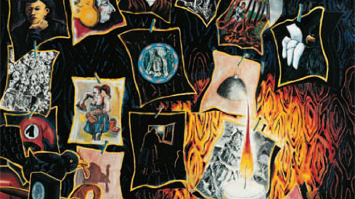 Die Ergebnisse künstlerischer Produktion: Bilder von Menschen, von der Schöpfung; zahlreiche Zitate anderer Bilder. Die gesamte Komposition wirkt verschlossen, abgeriegelt, fast wie eineKlagemauer. Die Welt ebenso wie die Ewigkeit liegen dahinter.[Die Abbildung zeigt einen Ausschnitt.]