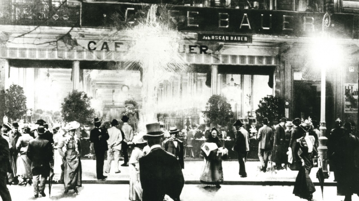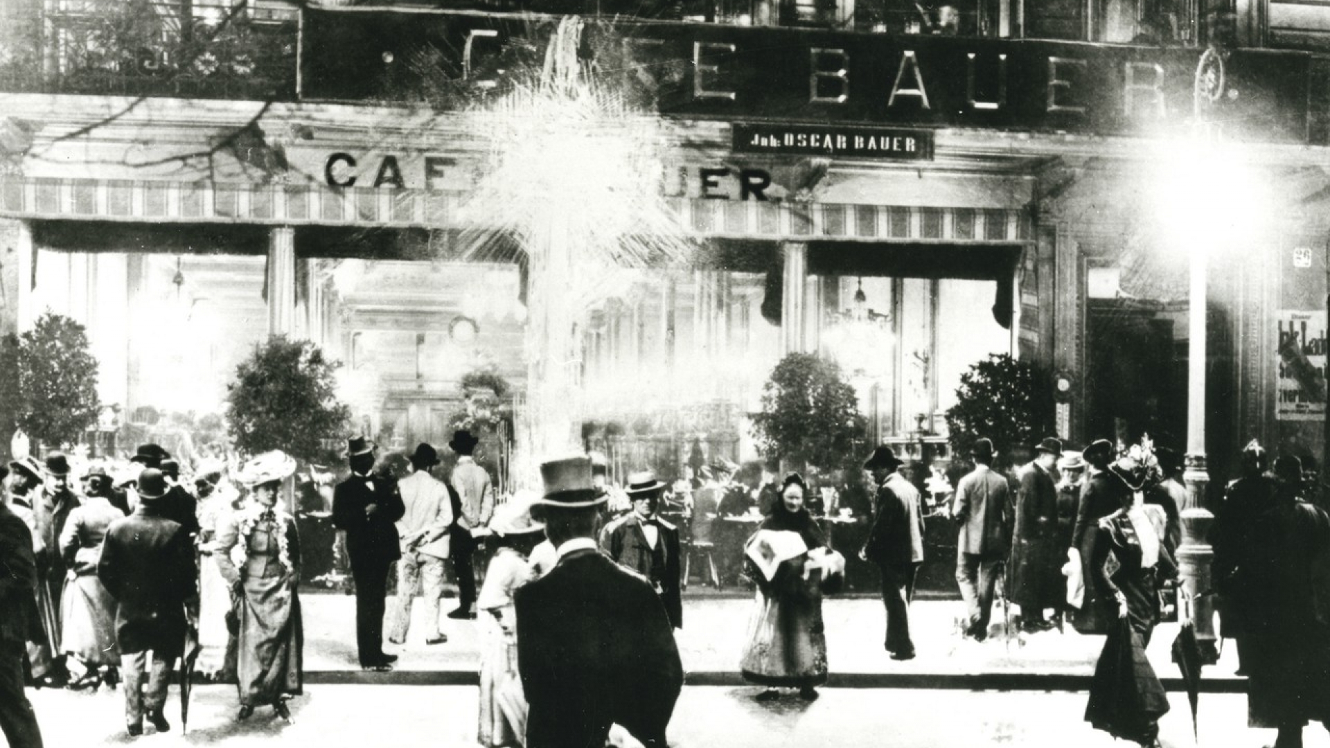 O du Berlin, du bunter Stein, du Biest.Du wirfst mich mit Laternen wie mit Kletten.Ach, wenn man nachts durch deine Lichter fließtDen Weibern nach, den seidenen, den fetten.Von Alfred LichtensteinDas Café Bauer wurde 1884 als erstes Caféhaus Berlins mit elektrischer Beleuchtung ausgestattet.