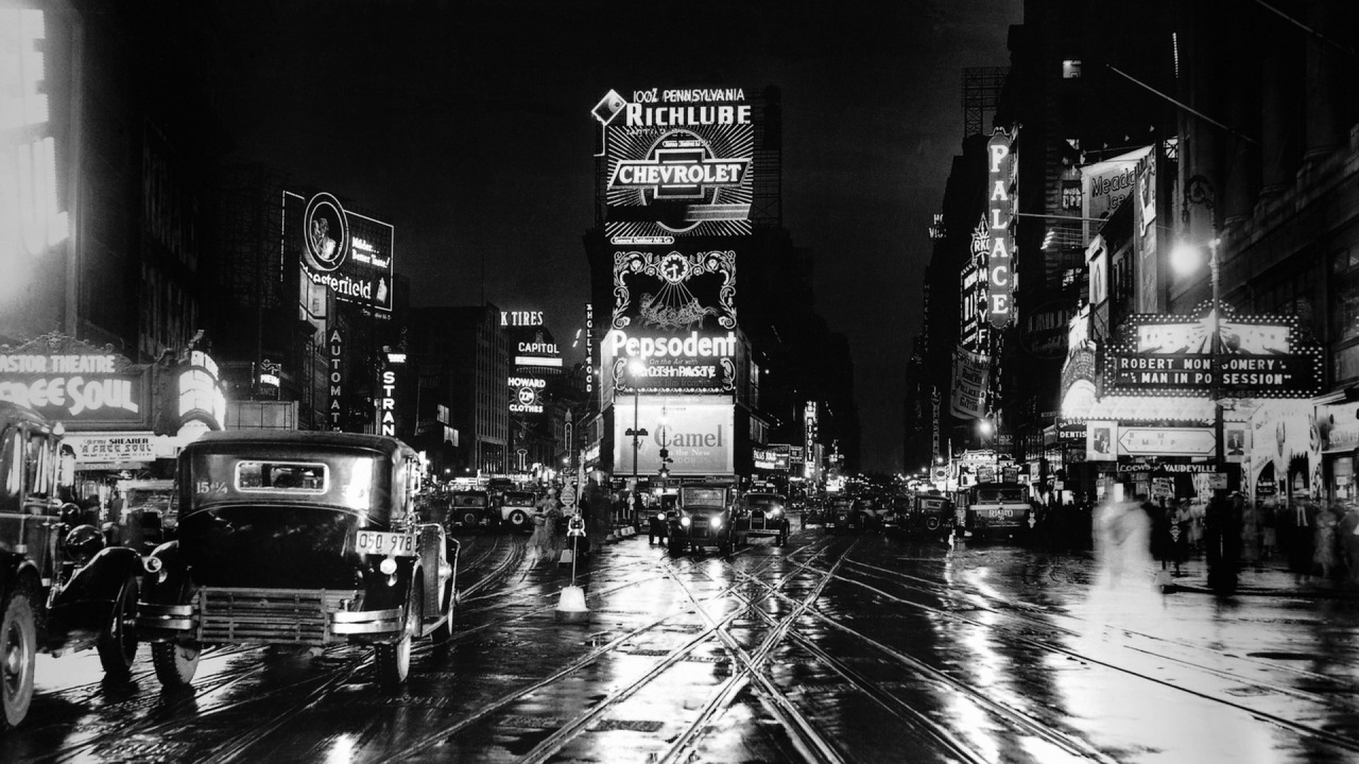 Die Straße, die den Westen mit dem OstenUnd wieder weiter mit dem Westen verbindet,Betrat Ich einst: Der Erde Reichtum fließtDurch diese Riesenader von New York.Der Völker bunte Mischung sah ich hasten,Doch drängte sich der Yankee klug und rastlos...Von Detlev von LiliencronNew York Times Square 1931