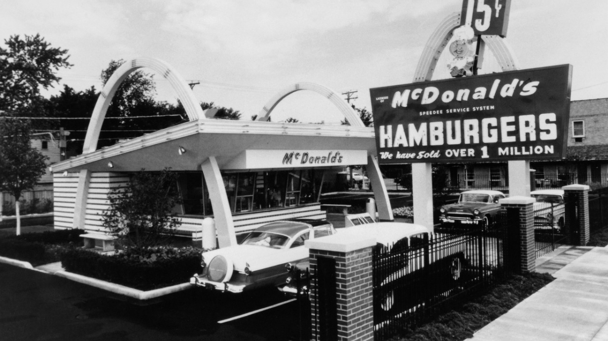 Erst einmal ganz schnell ausgewählt,dann noch das Kleingeld abgezählt.Kommt die Bestellung von den Lippen,beginnt die Dame mit dem Tippen.Das Brötchen fällt aus einer Klappe,Es schmeckt nachher wie weiche Pappe.Mit Remoulade eingecremtWird es, damit sich's etwas dehnt,dann kommt die Frikadelle rein,ganz flach gepresst und fuchtbar klein.Mit Krautsalat wird dick garniert,'ne Ladung Ketchup draufgeschmiert,das Ganze in Papier gesteckt,gibt´s Hamburger auf dem Tablett....Die Temp'ratur des Dings ist lau.Das Ketchup spritzt Dir ganz genauauf die Krawatte, auf den Bauchund auf die Ärmel läuft es auch.Vom Mund herab, auf beiden Seiten,leider lässt sich´s kaum vermeiden,rinnt nun die Remouladensoßeschleimig auf die neue Hose.Der Krautsalat fällt auch heraus.Es sieht wie auf dem Schlachtfeld aus!Die Hauptsache, die Frikadelleschmeckt nach alter Hühnerpelle.Sie wird Dich noch paar Stunden plagenund liegt Dir wie ein Stein im Magen.Und die Moral von diesem Graus:Meide jeden Fastfood-Schmaus!Von TaffErstes McDonalds Drive-In 1955