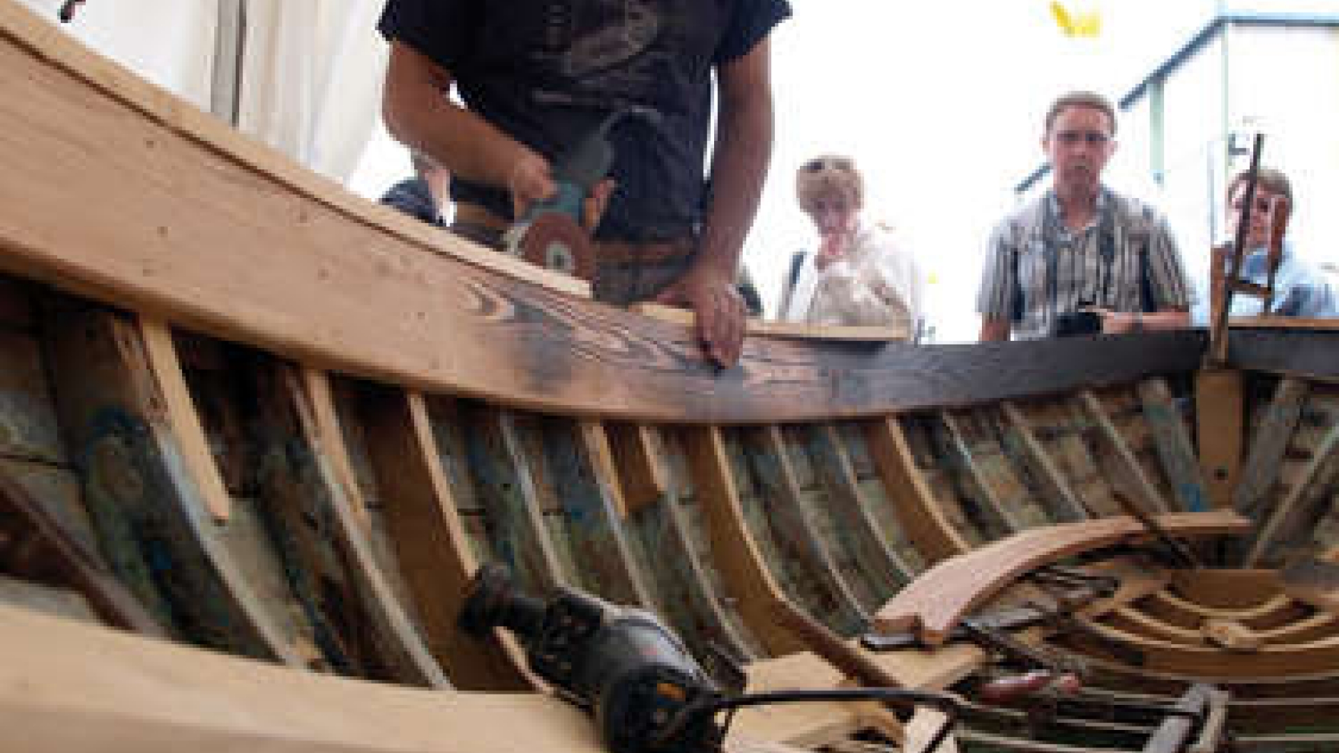 Ein Zimmermann restauriert ein altes Boot beim Maritime Festival Brest in Frankreich. Das sieht man so selten, dass man gern zuschaut.
