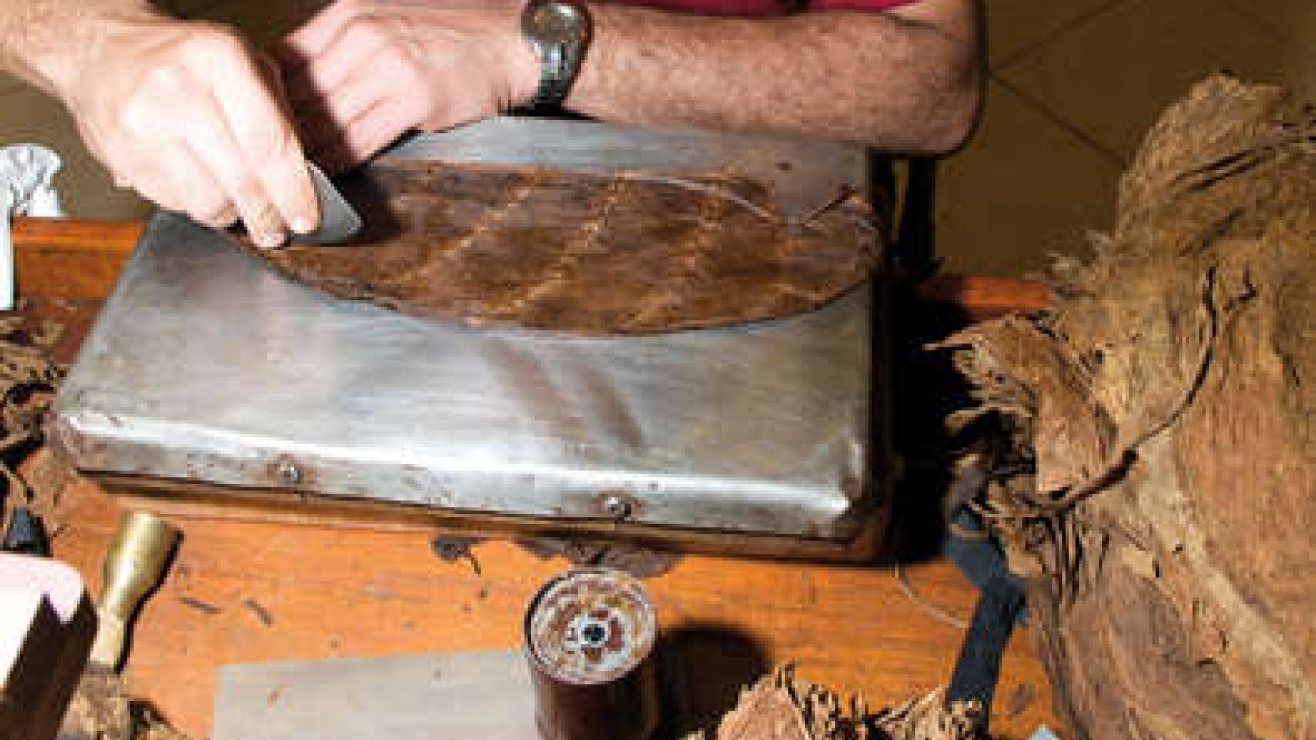 Eine gelernte Kraft stellt in Managua (Nicaragua) handgerollte Zigarren her. Eine Zigarre besteht aus Einlage, Umblatt und Deckblatt. Die fermentierten Tabakblätter werden durch Anfeuchten geschmeidig gemacht und für die Anfertigung der Einlage entrippt und getrocknet. Die Einlage wird je nach Art der Zigarre gemischt und mit einem feuchten Umblatt umhüllt. Der Genuss von Tabak in Form zusammengerollter Blätter war schon den Eingeborenen in Amerika bekannt, wo er von Kolumbus entdeckt wurde. Die Ursprünge der Zigarrenfabrikation liegen in Kuba, von wo sie 1720 nach Spanien gelangte. In Deutschland wurde das Zigarrenrauchen Anfang des 19. Jahrhunderts durch die napoleonischen Truppen bekannt.