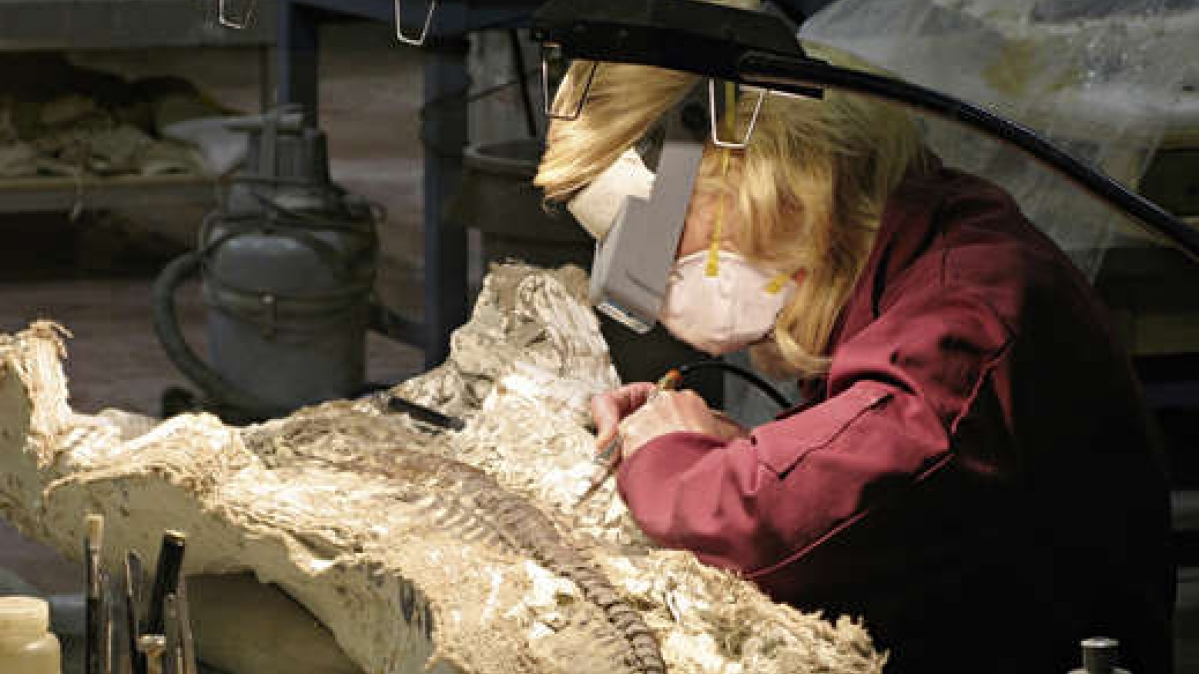 Paläontologen beschäftigen sich mit dem Leben in der Vorzeit. Sie untersuchen vor allem Fossilien. Das Bild zeigt das Skelett eines Dinosauriers.