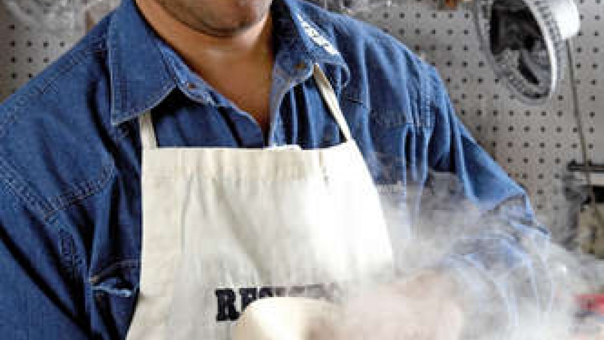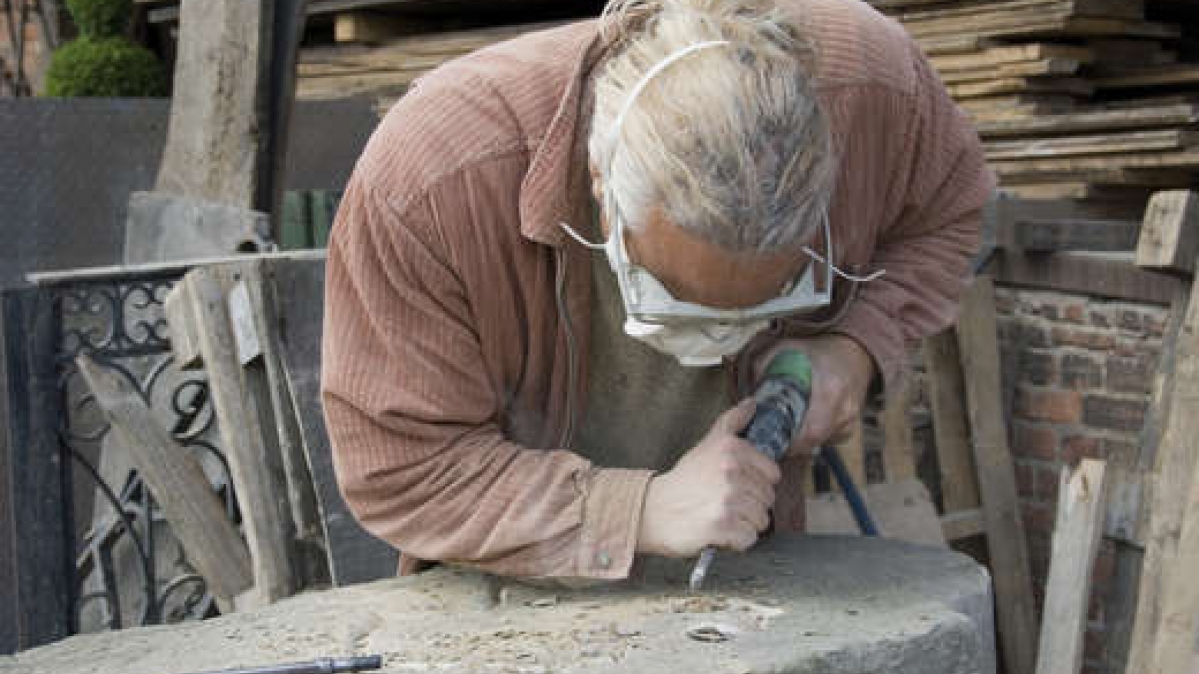 Bildhauer, Steinmetz, Künstler - der Mann ist all das. Als Steinmetz ist er starker Staubbelastung ausgesetzt. Lungenerkrankungen sind in diesem Beruf nicht selten. Um vorzubeugen, tragen die Handwerker Maske, Brille und Atemschutz.