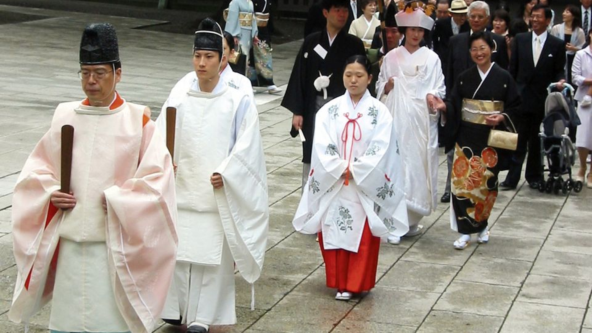 Mit der traditionellen Shinto-Zeremonie werden in Japan die meisten Trauungen vollzogen. Ein Shinto-Priester segnet und reinigt das Brautpaar spirituell, bevor der Bräutigam seinen Eid leistet. Nach der Zeremonie werden den "Kami" - den heiligen Geistern - Opfergaben in Form von Zweigen gemacht und Sake - Reiswein - getrunken.