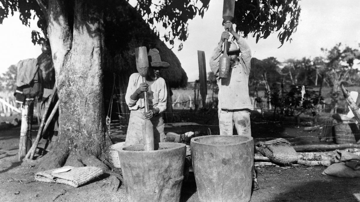 hier: Kaffee-Stampfer 1922 in Mexiko noch ohne moderne GerätschaftenMeistens erfolgt die Kaffeeernte von Hand. Für die besten Kaffeesorten werden nur die reifen Kirschen einzeln abgesammelt. Bei der weniger aufwändigen „Strip-Pflückung“ werden die Früchte unabhängig von ihrem Reifegrad alle gleichzeitig abgestreift. Eine Ausnahme bilden die großen Kaffeefarmen Brasiliens, auf denen Maschinen eingesetzt werden können.Die Verarbeitung des Kaffees ist sehr arbeitsintensiv. Um den marktfähigen Kaffee zu erhalten, müssen alle Umhüllungen der Kaffeebohnen entfernt werden. Dazu gibt es zwei Verfahren: Bei der trockenen Aufbereitung werden die Kaffeekirschen an der Luft getrocknet, bis sich die Bohnen herausschälen lassen. Die nasse Aufbereitung ergibt eine bessere Qualität, ist aber an das Vorhandensein von genügend Wasser gebunden. Hierbei wird der größte Teil des Fruchtfleischs mechanisch entfernt. Durch anschließende Fermentation können die anhaftenden Reste abgewaschen werden. So erhält man den Pergamentkaffee. Durch Abschälen der Pergamenthülle und der Silberhaut gewinnt man schließlich den hellen, grünlichen Rohkaffee.