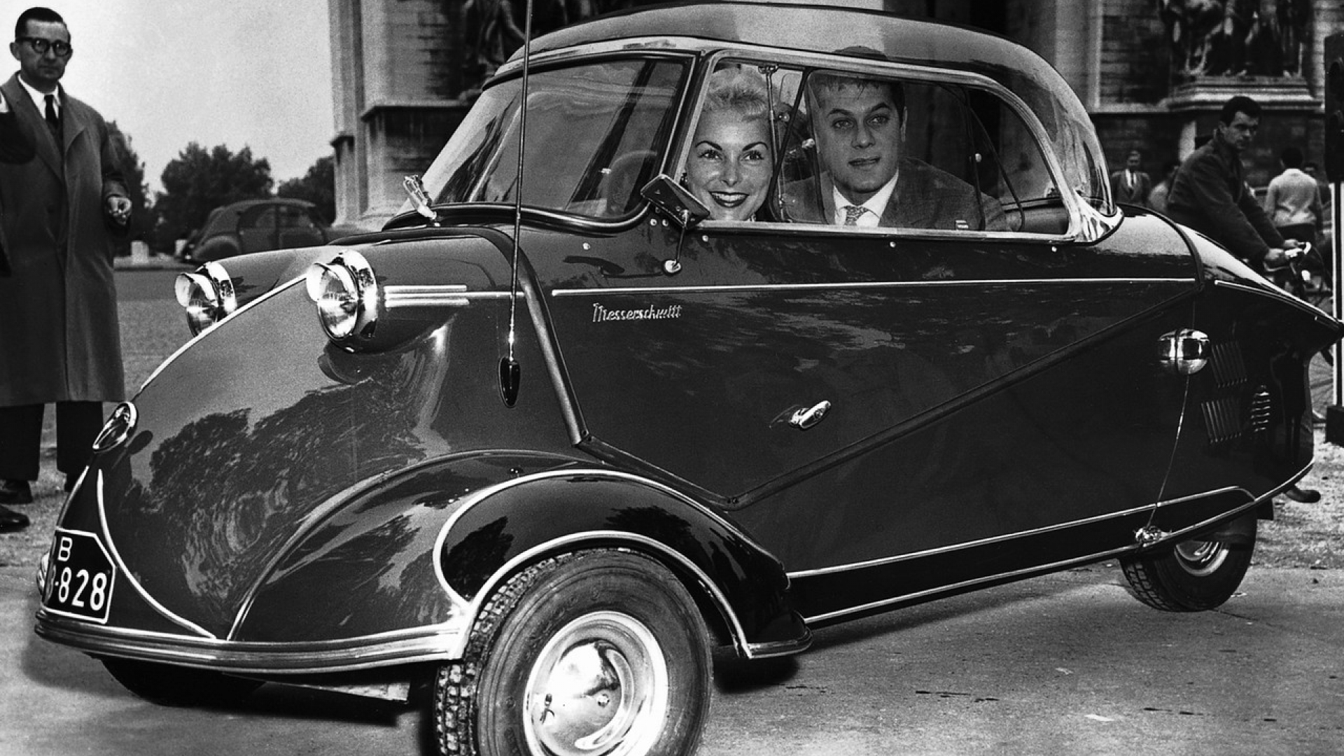 Zu den erfolgreichsten Neuheiten auf dem bundesdeutschen Kfz-Markt zählen 1953 Kleinstwagen wie der "Messerschmitt-Kabinenroller" und die "BMW-Isetta". Populär wird besonders der von der Firma Messerschmitt produzierte so genannte Kabinenroller. Das dreirädrige Gefährt, ein Mittelding zwischen Motorroller und Auto, wird bei einem Preis von 2375 DM für viele zur erschwinglichen Alternative zum Pkw. Der Kabinenroller bietet zwei Personen hintereinander Platz. Er hat einen 9 PS starken Motor mit einem Zylinder und 175 ccm Hubraum und erreicht eine Geschwindigkeit von 75 km/h. Ein- und Ausstieg muss man eine Dachhaube aufklappen.Konkurrent des Kabinenrollers auf dem Kleinstwagenmarkt ist die "Isetta" (9,5 PS, 236 ccm, 85 km/h), deren Serien-Produktion BMW in diesem Jahr aufnimmt. Dieses in Italien entwickelte so genannte Motocoupé kostet mit 4000 DM fast so viel wie ein VW-Käfer. Originell ist besonders der Einstieg durch die aufklappbare Vorderfront.Unser Foto aus dem Jahr 1955 zeigt die Schauspielerin Janet Leigh, die von ihrem Ehemann Tony Curtis mit einem besonderen Geschenk überrascht wird, nämlich einem Messerschmitt Kabinenroller FMR TG 500.