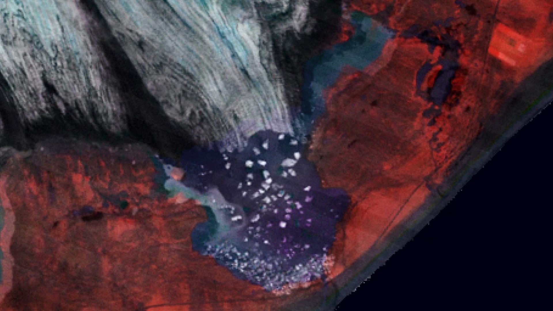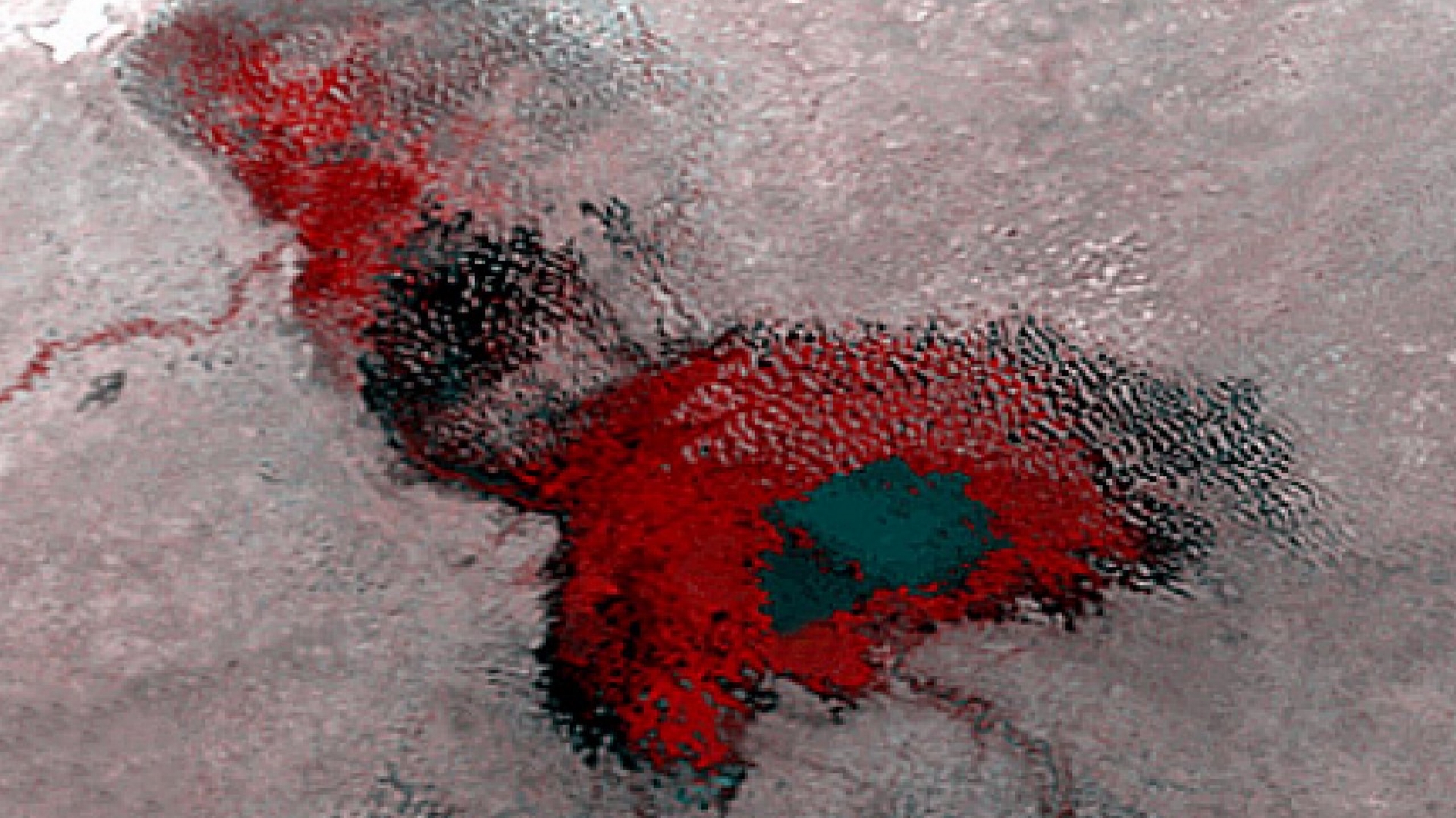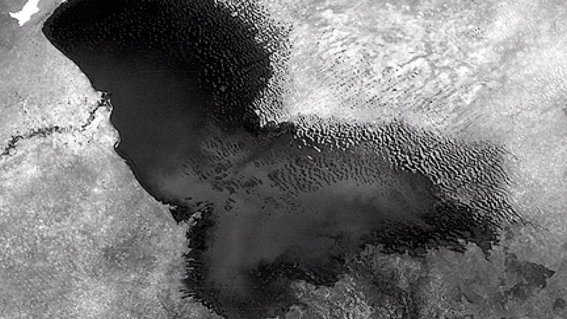 Dieses Foto stammt vom 31. Januar 2002 und zeigt das Schelf im Spätsommer mit dunkelblauen Schmelzwasserbereichen, die als Punkte sichtbar sind.