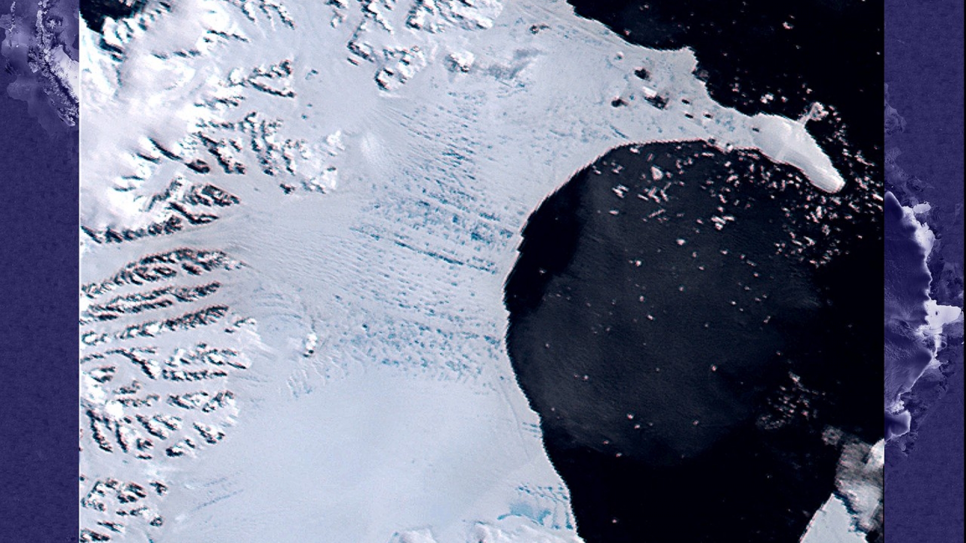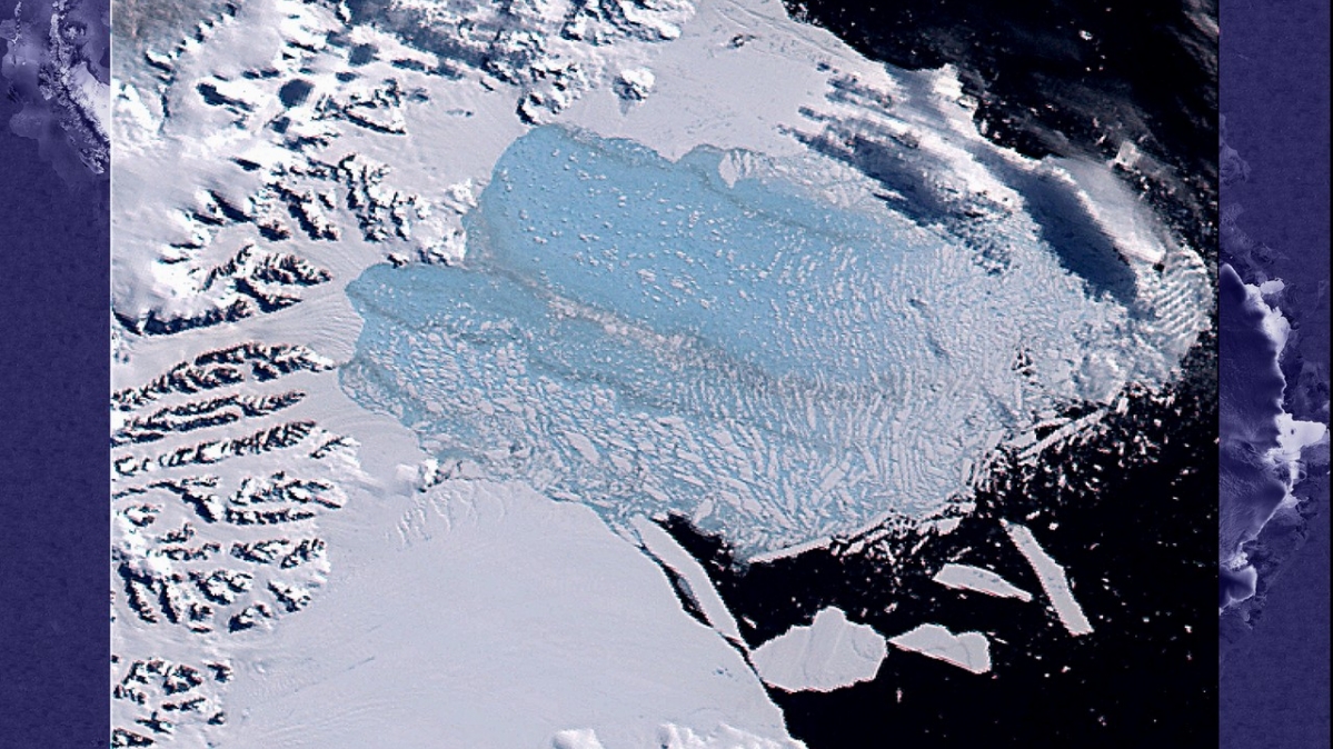 Dieses Bild stammt vom 7. März 2002 und zeigt Tausende zersplitterte Eisberge und eine große hellblaus Fläche, die aus extremst fein zerteilten Eisstücken, wo ehemals das Schelf lag.