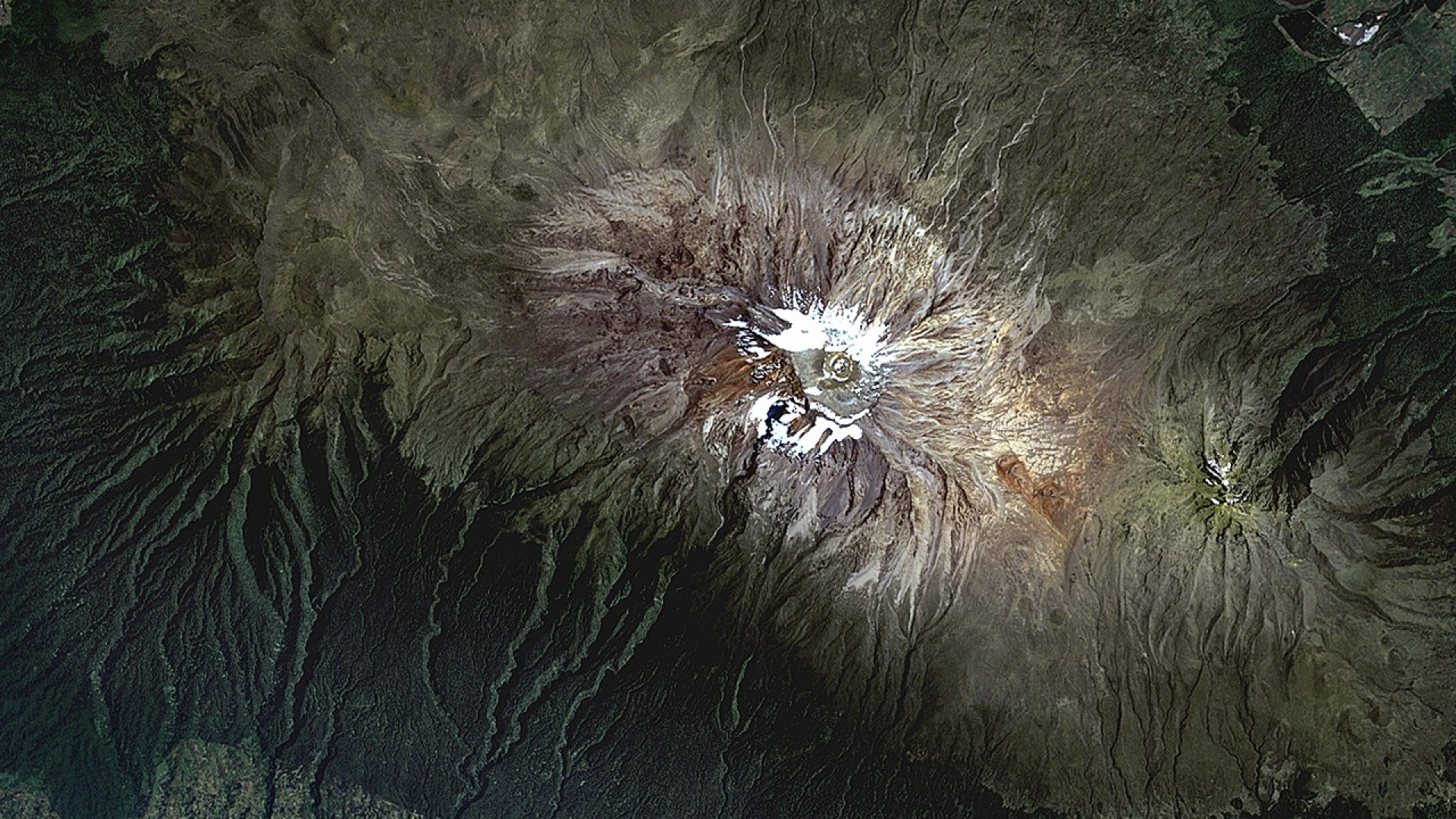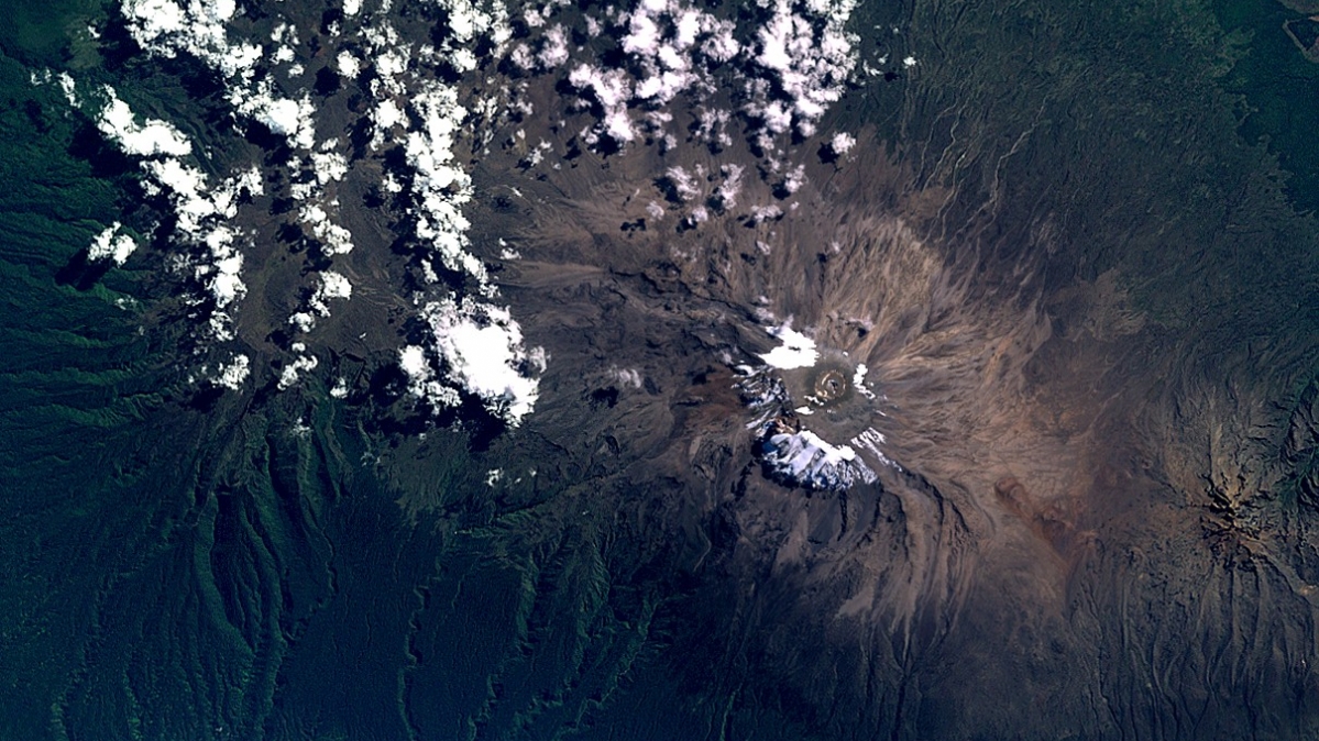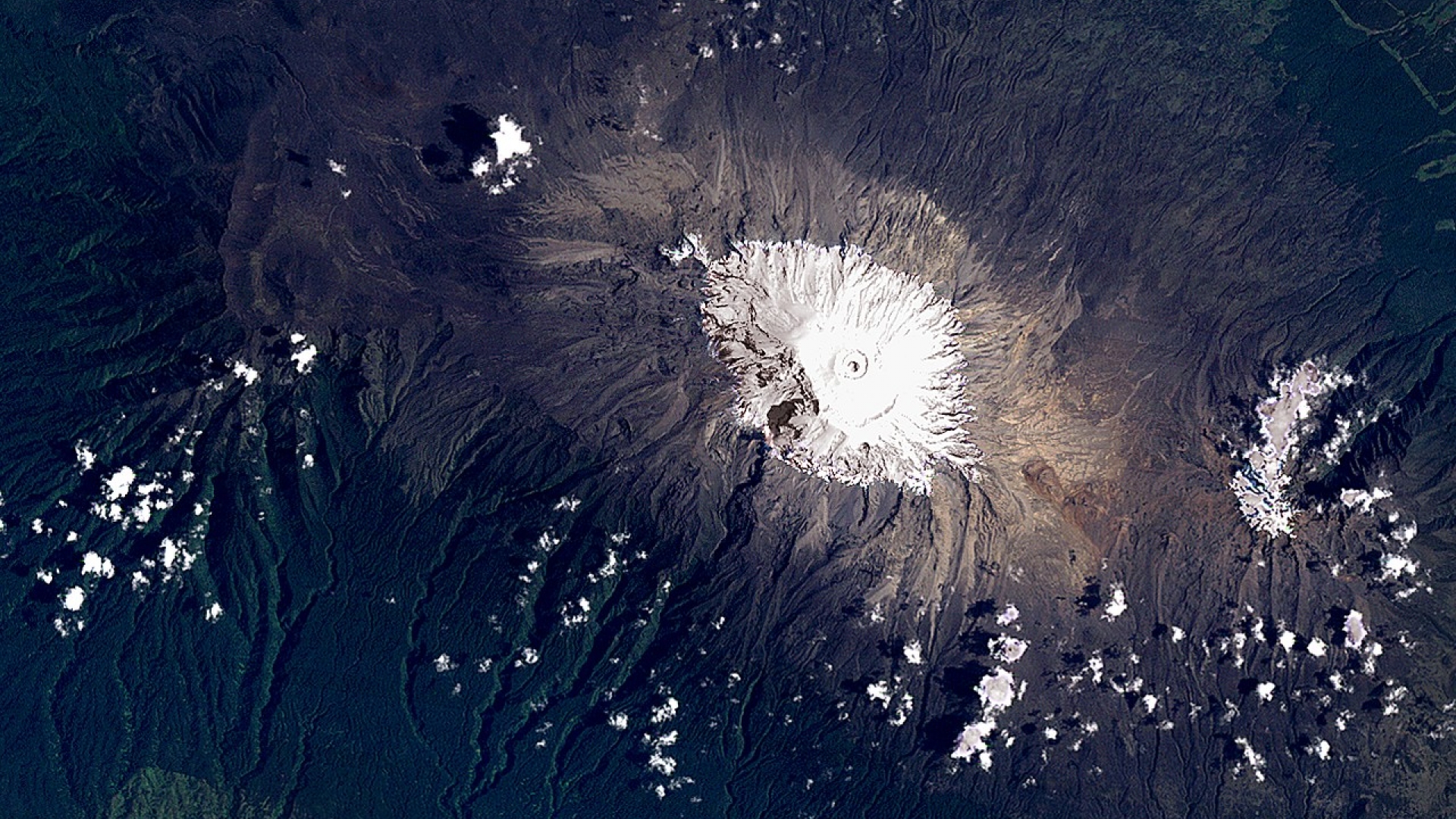 Der Kilimandscharo liegt im Norden von Tansania, rund drei Grad südlich des Äquators. Mit seiner Höhe von 5896 Metern ist er die höchste Erhebung des schwarzen Kontinents. Sein eingedeutschter Name stammt von “kilima njaro“, was auf Swahili soviel wie “Weißer Berg“ bedeutet. Bei den Masai heißt er “oldoinyo oibor“, und das bedeutet ebenfalls “Weißer Berg“. Dieses und die zwei folgenden Bilder zeigen, wie sich die 11.000 Jahre alte Eiskappe des Berges fast völlig aufgelöst hat.