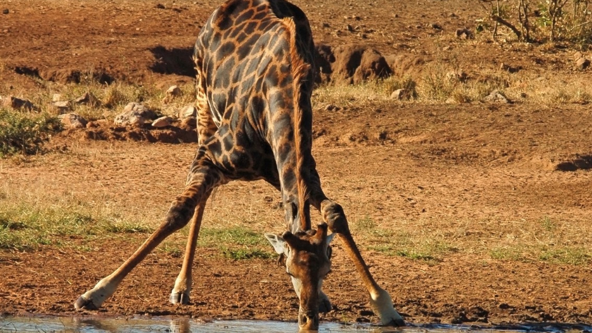 Giraffe trinkt an einer Wasserstelle im Krüger National Park.