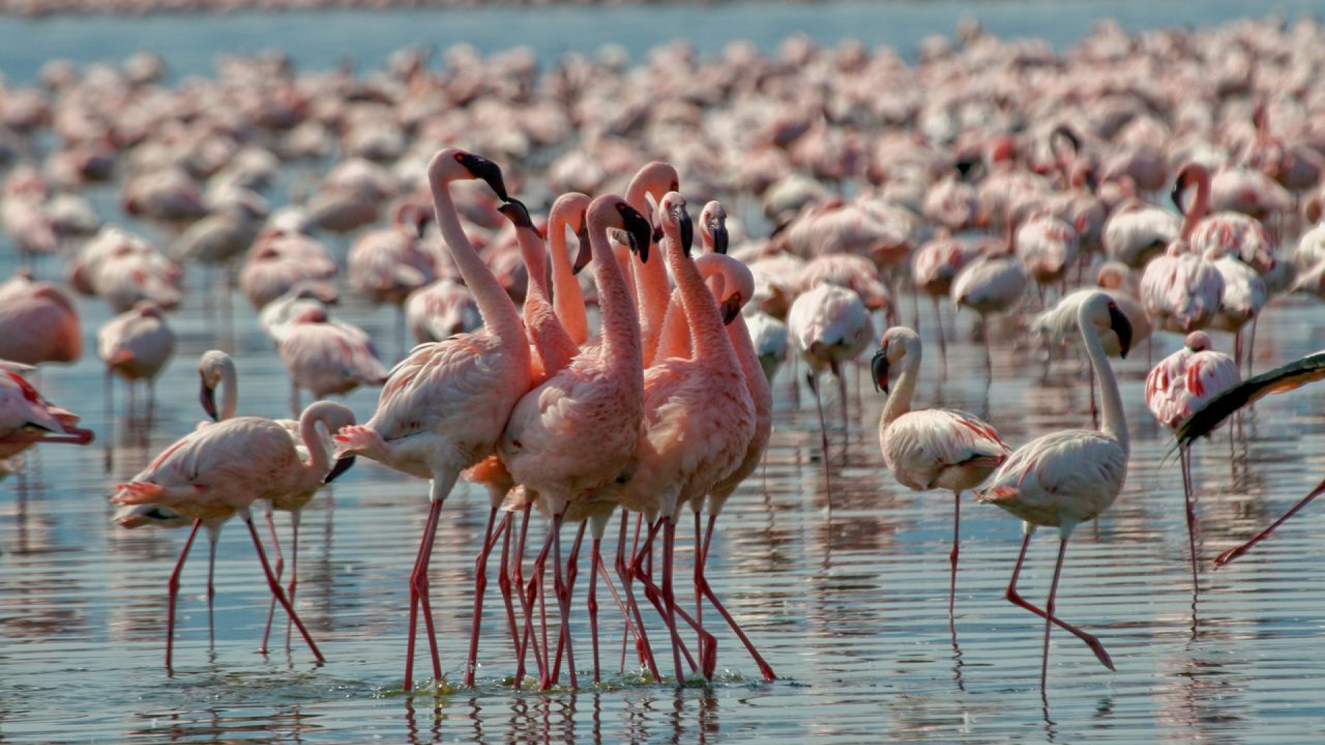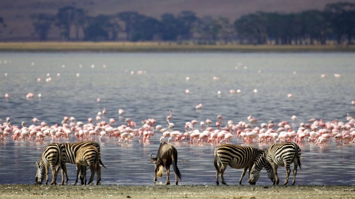 Ngorongoro Krater mit Flamencos und Zebras in Tansania