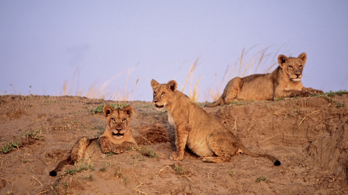 Drei junge Löwen im Mana Pools Nationalpark, Zimbabwe.