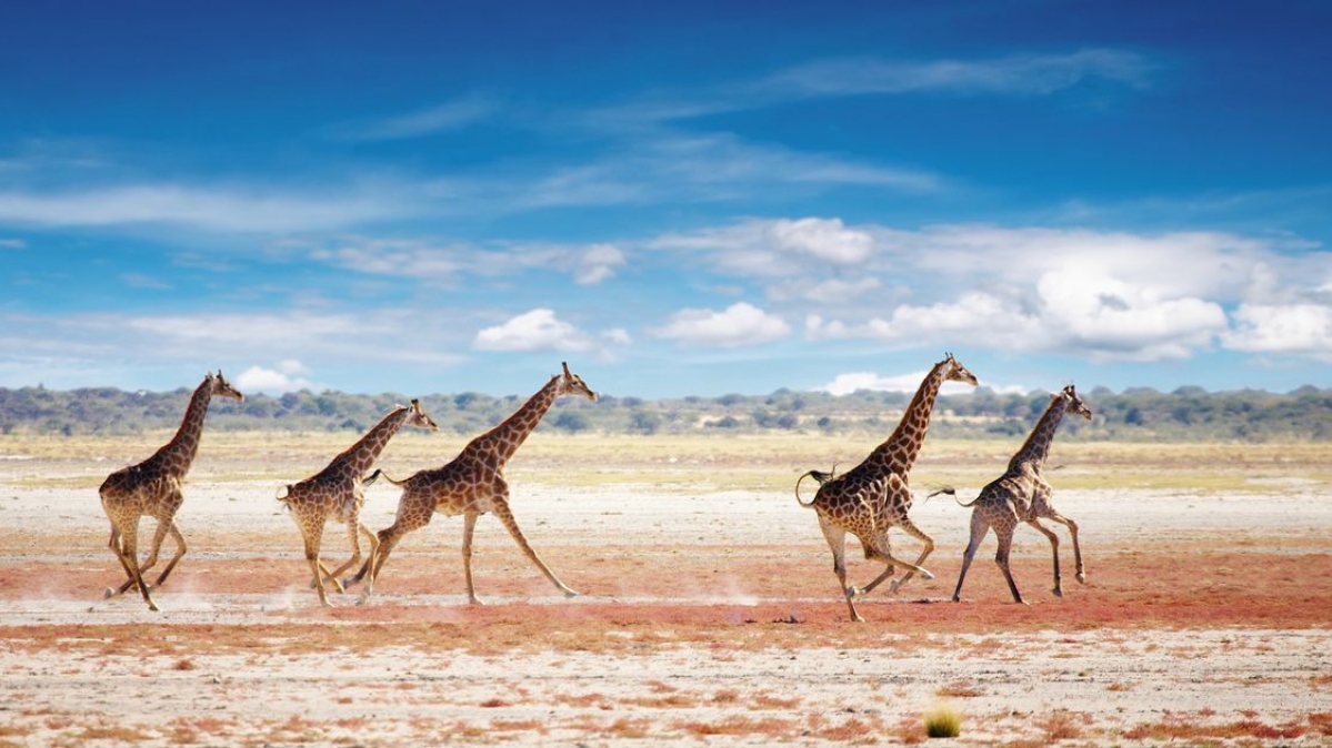 Herde Giraffen galoppieren durch die afrikanische Savanne im Etosha Nationalpark, Namibia.