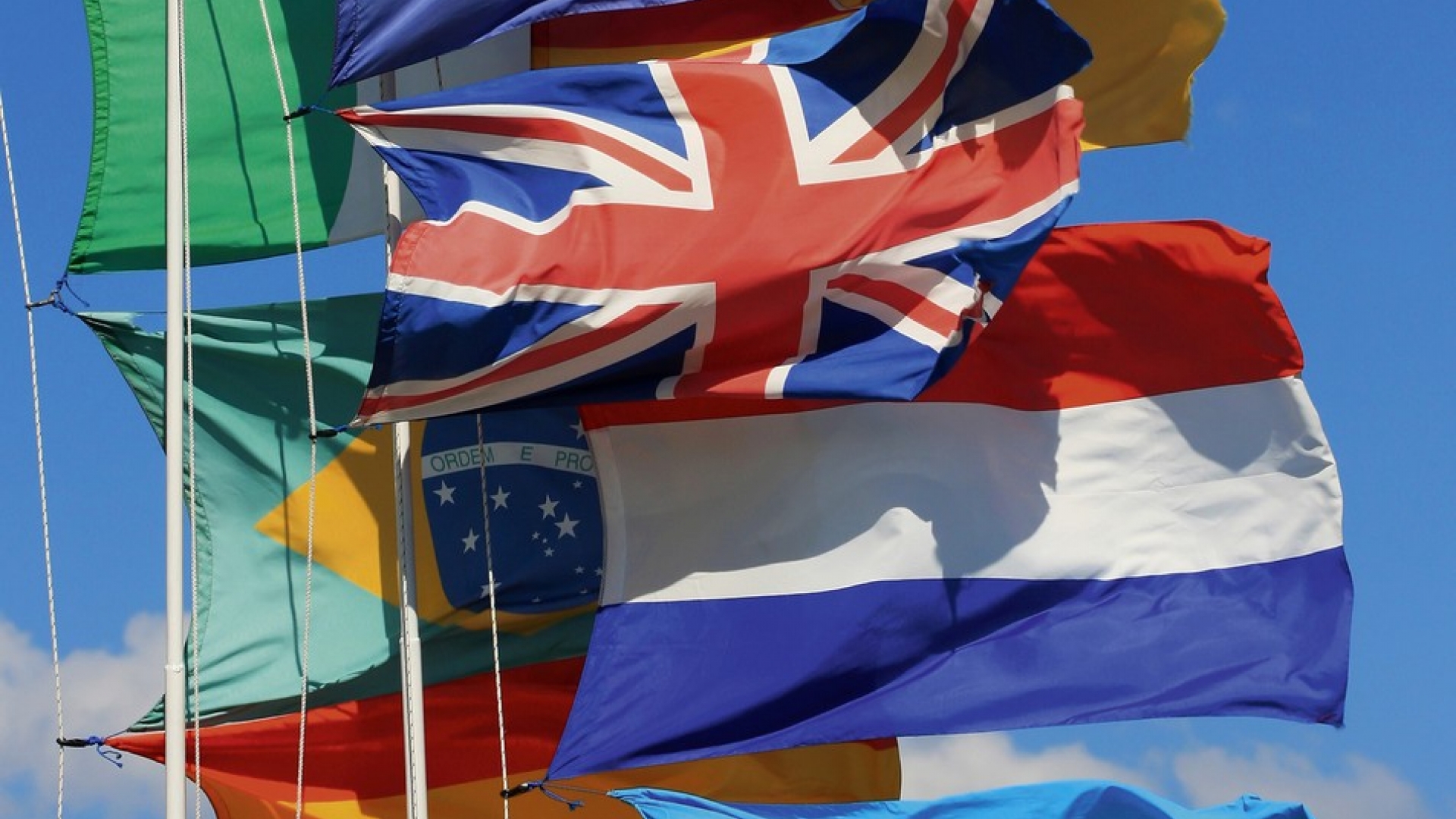 Die Nationalflaggen von Frankreich, Großbritanien, Italien, Spanien, Deutschland, Brasilien, Argentinien und die EU-Flagge flattern im Wind.