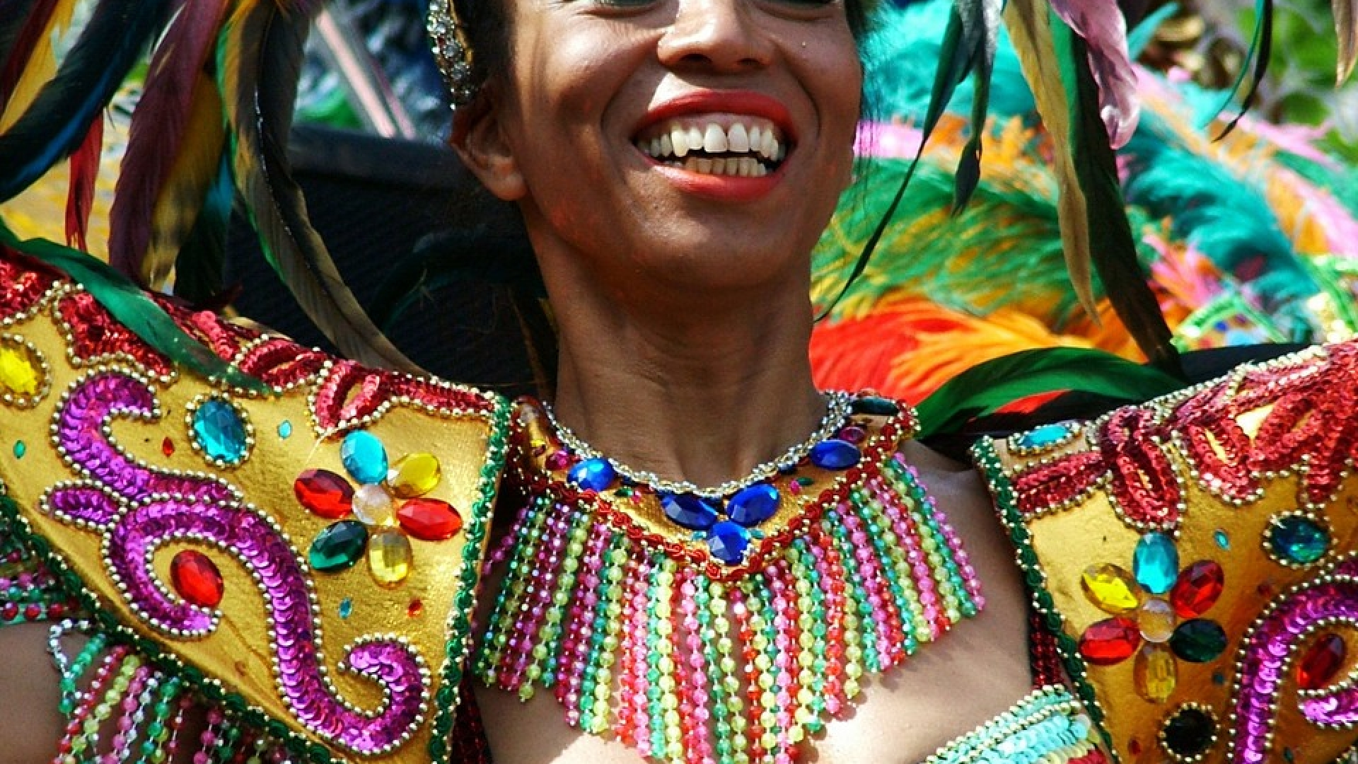 Eine farbenfroh-glückliche Samba-Tänzerin beim Karnevalsumzug in Brasilien.