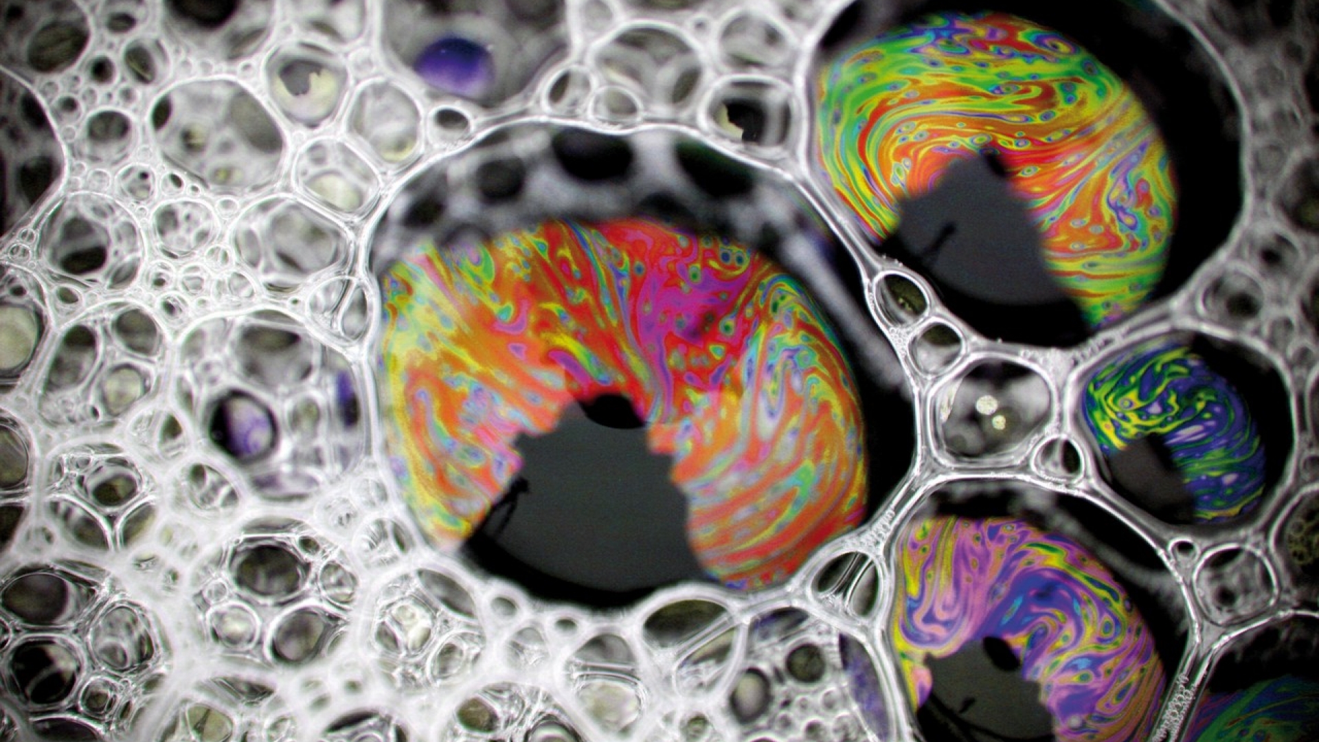 Licht spiegelt sich in den Seifenblasen. Einfallendes Licht wird an den Wänden der Blase reflektiert - je nach Wandstärke stärker oder schwächer. So kommt es zu verschiedenen Farbschattierungen. Bei einer dicken Wand werden mehr rote Lichtwellen ausgelöscht, und man sieht eine blau-grüne Färbung. Wenn die Wand überall gleich dick ist, ist die Seifenblase einfarbig.