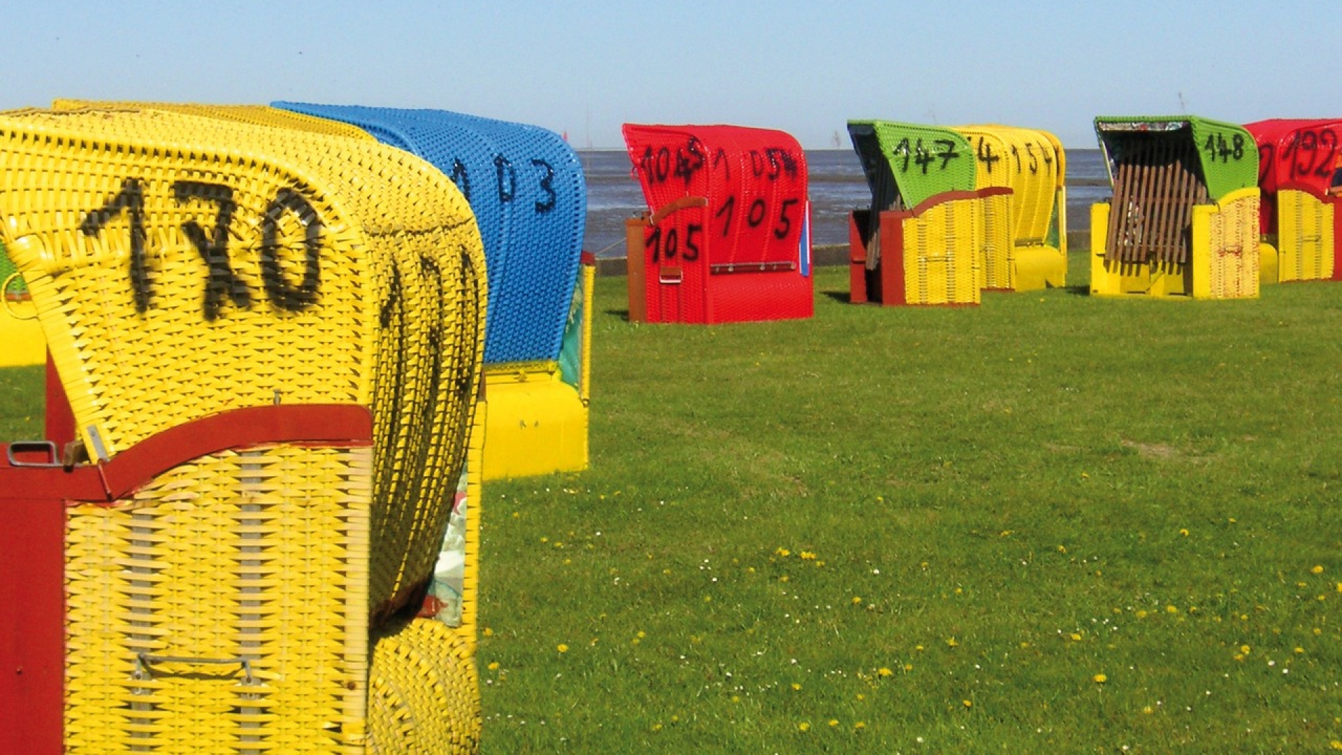 Schön unkonventionell: ein Wiesen-Strand mit bunten Strandkörben.