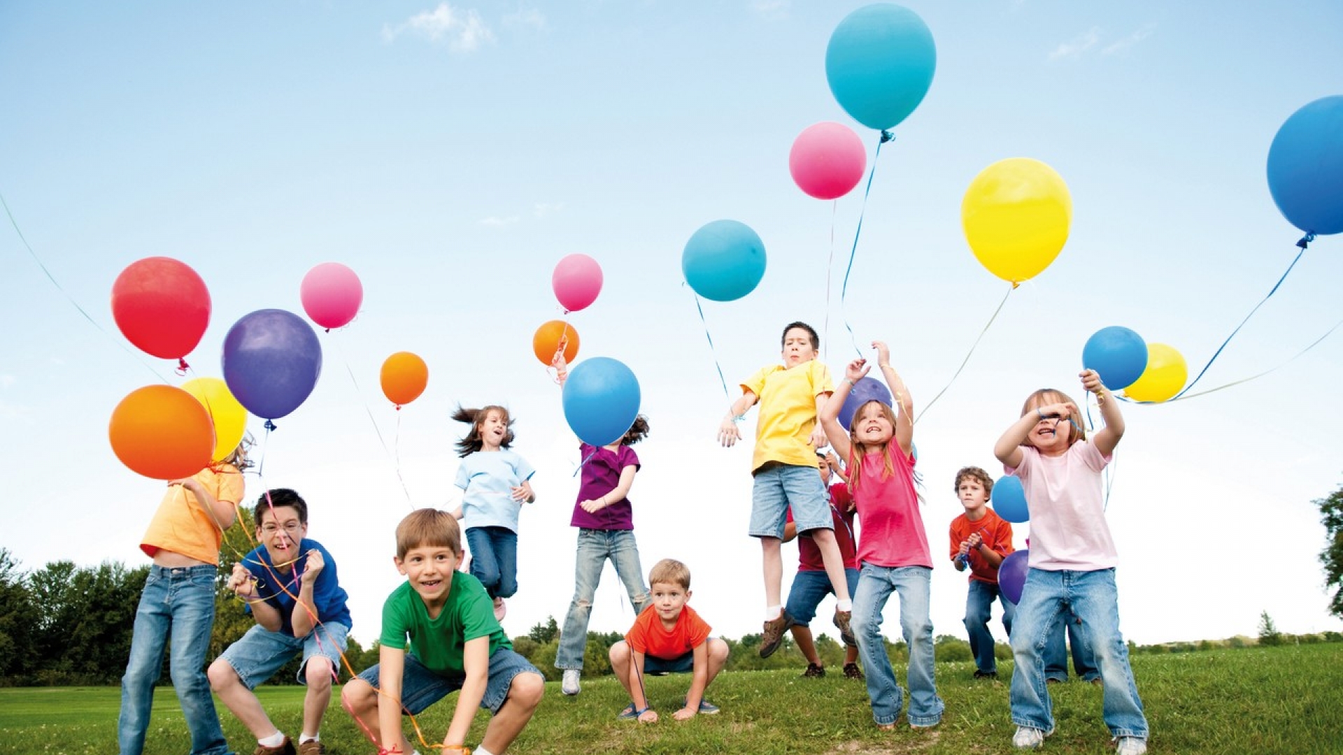 Mit Ballons steigt auf jedem Kindergeburtstag die Party; Grundschulvergnügen unterm wolkenlosen Himmel.