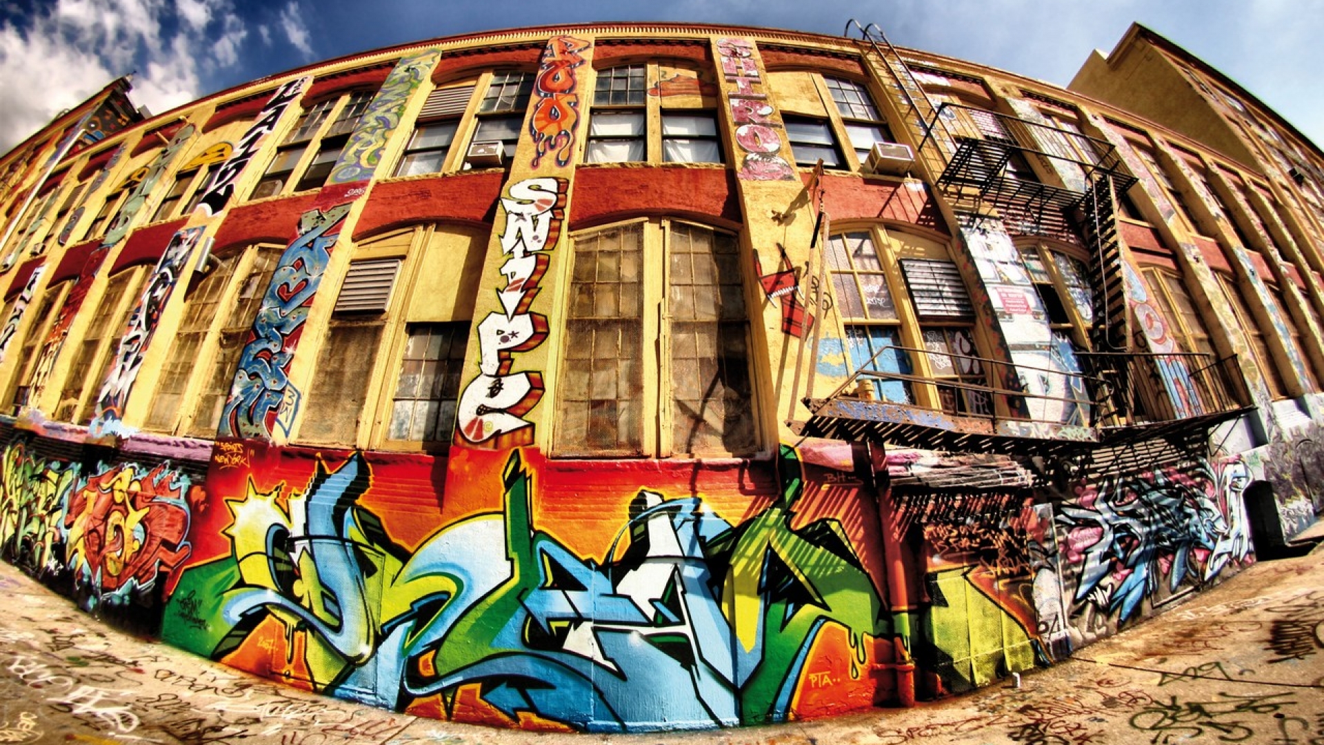Die Fischaugeaufnahme eines bunten, mit Graffiti besprühtem Gebäudes in London.