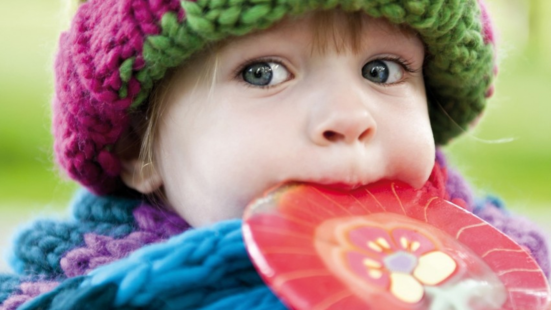 Waren die Augen da wohl zu groß? Ein Mädchen versucht sich am Riesen-Dauerlutscher.