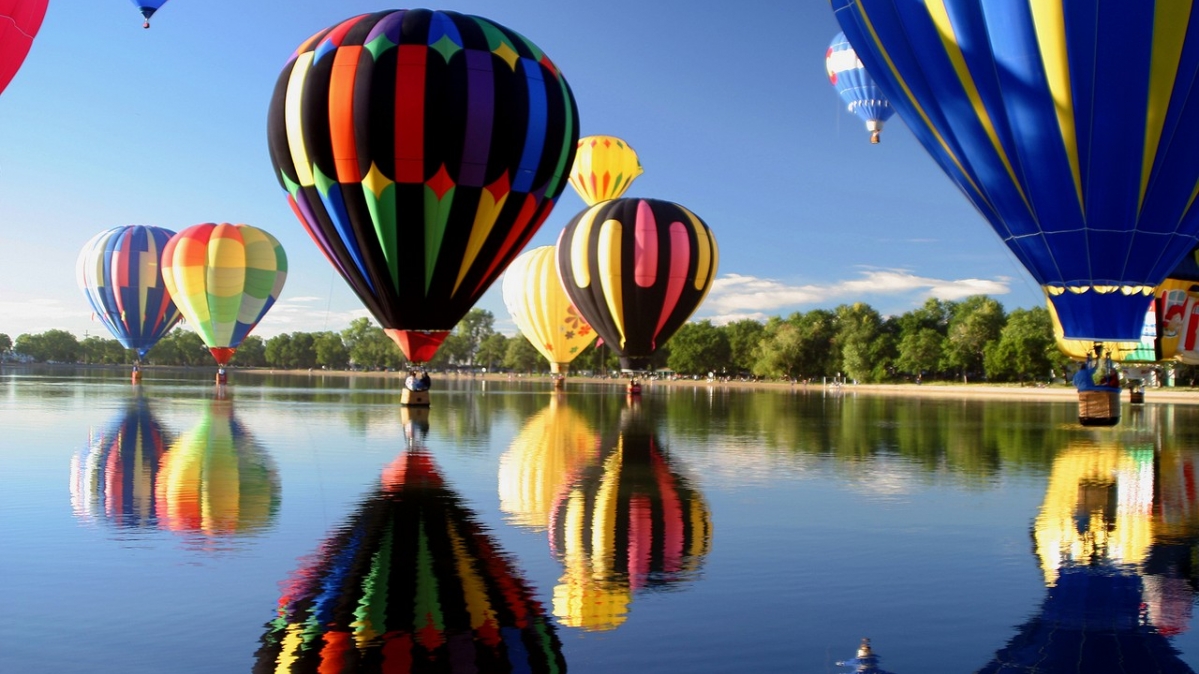 Herrliche Spiegelbilder im Wasser. Im Frühjahr sieht man viele dieser bunten Tupfer am Himmel: Heißluftballons über Heißluftballons schwebem in der Luft.